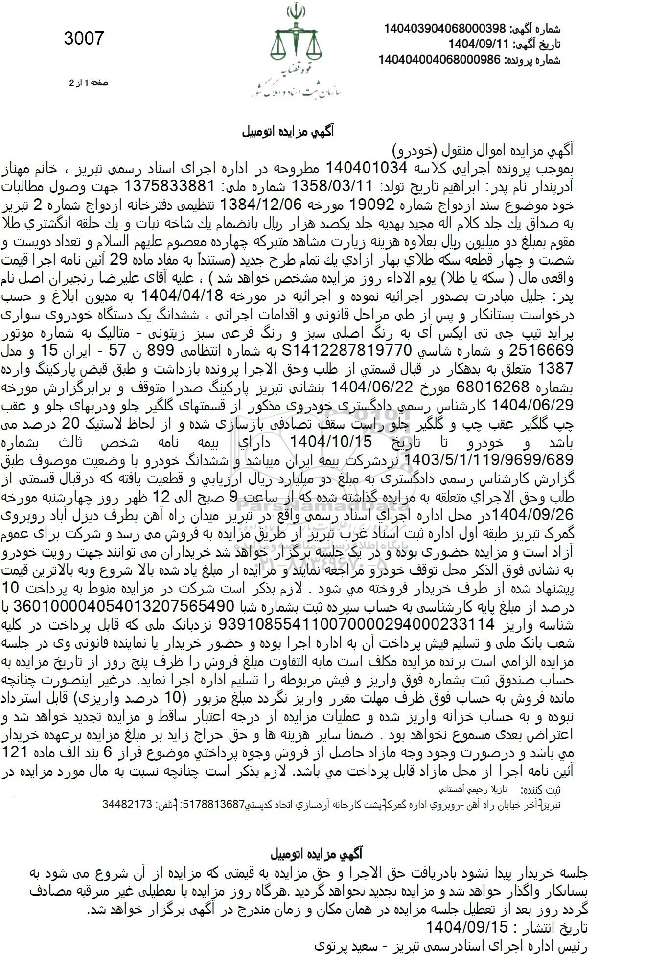 بموجب پرونده اجرایی کلاسه 140401034 مطروحه در اداره اجرای اسناد رسمی تبریز ، خانم مهناز آذرپندار نام پدر ابراهیم تاریخ تولد 1358.03.11 شماره ملی: 1375833881 جهت وصول مطالبات خود موضوع سند ازدواج شماره 19092 مورخه 1384.12.06 تنظیمی دفترخانه ازدواج شماره 2 تبریز به صداق يک جلد کلام اله مجيد بهديه جلد يکصد هزار ريال بانضمام يک شاخه نبات و يک حلقه انگشتري طلا مقوم بمبلغ دو میلیون ریال بعلاوه هزینه زیارت مشاهد متبرکه چهارده معصوم علیهم السلام و تعداد دویست و شصت و چهار قطعه سکه طلاي بهار آزادي يک تمام طرح جديد (مستند) به مفاد ماده 29 آئین نامه اجرا قیمت واقعی مال ) سکه یا طلا یوم الاداء روز مزایده مشخص خواهد شد ) ، علیه آقای علیرضا رنجبران اصل نام پدر جليل مبادرت بصدور اجرائیه نموده و اجرائیه در مورخه 1404.04.18 به مدیون ابلاغ و حسب درخواست بستانکار و پس از طی مراحل قانونی و اقدامات اجرائی، ششدانگ یک دستگاه خودروی سواری پراید تیپ جی تی ایکس ای به رنگ اصلی سبز و رنگ فرعی سبز زیتونی - متالیک به شماره موتور به شماره انتظامی 899 0 57 - ایران 15 و مدل S1412287819770 2516669 و شماره شاسي سمه 1387 متعلق به بدهکار در قبال قسمتی از طلب وحق الاجرا پرونده بازداشت و طبق قبض پارکینگ وارده بشماره 68016268 مورخ 1404.06.22 بنشانی تبریز پارکینگ صدرا متوقف و برابرگزارش مورخه 1404.06.29 کارشناس رسمی دادگستری خودروی مذکور از قسمتهای گلگیر جلو و دربهای جلو و عقب چپ گلگیر عقب چپ و گلگیر جلو راست سقف تصادفی بازسازی شده و از از لحاظ لاستیک 20 درصد می باشد و خودرو تا تاریخ 1404.10.15 داراي نامه شخص ثالث بشماره 1403.5.1.119.9699.689 نزد شرکت بیمه ایران میباشد و ششدانگ خودرو با وضعیت موصوف طبق گزارش کارشناس رسمی دادگستری به مبلغ دو میلیارد ریال ارزیابی و قطعیت یافته که در قبال قسمتی از طلب وحق الاجرای متعلقه به مزایده گذاشته شده که از ساعت 9 صبح الى 12 ظهر روز چهارشنبه مورخه 1404.09.26 در محل اداره اجرای اسناد رسمی واقع در تبریز میدان راه آهن بطرف دیزل آباد روبروی گمرک تبریز طبقه اول اداره ثبت اسناد غرب تبریز از طریق مزایده به فروش میرسد و شرکت برای عموم آزاد است و مزایده حضوری بوده و در یک جلسه برگزار خواهد شد خریداران میتوانند جهت رویت خودرو به نشانی فوق الذکر محل توقف خودرو مراجعه نمایند و مزایده از مبلغ یاد شده بالا شروع و به بالاترین قیمت پیشنهاد شده از طرف خریدار فروخته می شود . لازم بذکر است شرکت در مزایده منوط به پرداخت 10 درصد از مبلغ پایه کارشناسی به حساب سپرده ثبت بشماره شبا 360100004054013207565490 با شناسه واريز 939108554110070000294000233114 نزدبانک ملی که قابل پرداخت در کلیه شعب بانک ملی و تسلیم فیش پرداخت آن به اداره اجرا بوده و حضور خریدار با نماینده قانونی وی در جلسه مزایده الزامی است برنده مزایده مکلف است مابه التفاوت مبلغ فروش را ظرف پنج روز از تاریخ مزایده به حساب صندوق ثبت بشماره فوق واریز و فیش مربوطه را تسلیم اداره اجرا نماید در غیر اینصورت چنانچه مانده فروش به حساب فوق ظرف مهلت مقرر واریز نگردد مبلغ مزبور (10) درصد واریزی قابل استرداد نبوده و به حساب خزانه واریز شده و عملیات مزایده از درجه اعتبار ساقط و مزایده تجدید خواهد شد و اعتراض بعدی مسموع نخواهد بود. ضمنا سایر هزینه ها و حق حراج زاید بر مبلغ مزایده بر عهده خریدار مي باشد و در صورت وجود وجه مازاد حاصل از فروش وجوه پرداختی موضوع فراز 6 بند الف ماده 121 آئین نامه اجرا از محل مازاد قابل پرداخت می باشد. لازم بذکر است چنانچه نسبت به مال مورد مزایده در