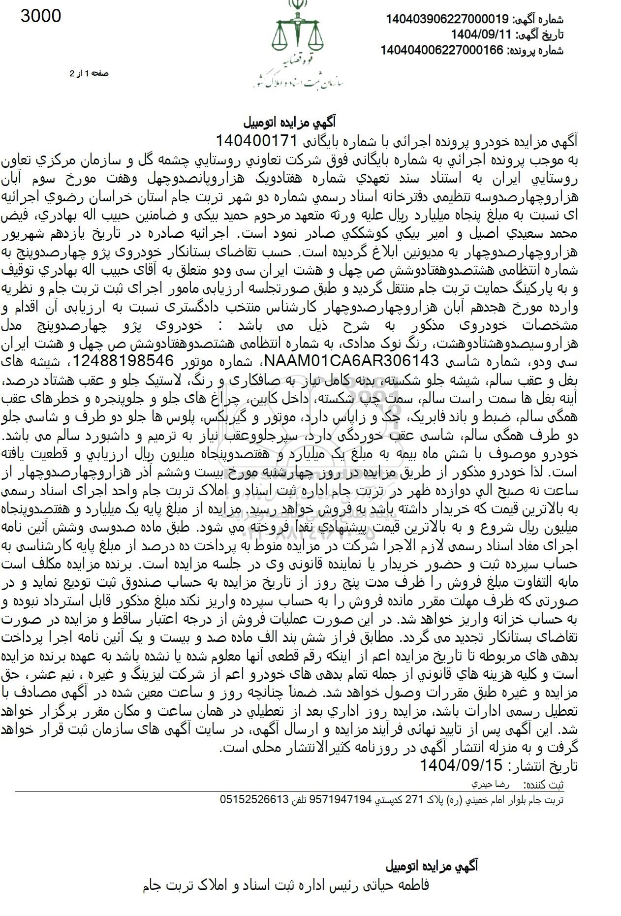 به موجب پرونده اجرائی به شماره بایگانی فوق شرکت تعاونی روستایی چشمه گل و سازمان مرکزی تعاون روستایی ایران به استناد سند تعهدی شماره هفتاد و یک هزار و پانصد و چهل و هفت مورخ سوم آبان هزار و چهار صدوسه تنظیمی دفترخانه اسناد رسمی شماره دو شهر تربت جام استان خراسان رضوی اجرائیه ای نسبت به مبلغ پنجاه میلیارد ریال علیه ورنه متعهد مرحوم حمید بیکی و ضامنین حبیب اله بهادری، فیض محمد سعیدی اصیل و امیر بیکی کوشککی صادر نمود است. اجرائیه صادره در تاریخ یازدهم شهریور هزار و چهار صد و چهار به مدیونین ابلاغ گردیده است. حسب تقاضای بستانکار خودروی پژو چهار صد و پنج به شماره انتظامی هشتصد و هفتادوشش ص چهل و هشت ایران سی و دو متعلق به آقای حبیب اله بهادری توقیف و به پارکینگ حمایت تربت جام منتقل گردید و طبق صورتجلسه ارزیابی مامور اجرای ثبت تربت جام و نظریه وارده مورخ هجدهم آبان هزار و چهار صدوچهار کارشناس منتخب دادگستری نسبت به ارزیابی آن اقدام او و مشخصات خودروی مذکور به شرح ذیل می باشد : خودروی پژو چهار صد و پنج مدل هزار و سیصد و هشتاد و هشت رنگ نوک مدادی به شماره انتظامی هشتصد و هفتادوشش ص چهل و هشت ایران سی و دو شماره شاسی NAAM01CA6AR306143 شماره موتور 12488198546، شیشه های بغل و عقب سالم شیشه جلو شکسته بدنه کامل نیاز به صافکاری و رنگ لاستیک جلو و عقب هشتاد درصد آینه بغل ها سمت راست سالم سمت چپ شکسته داخل کابین چراغهای جلو و جلوپنجره و خطرهای عقب همگی سالم ضبط و باند فابریک جک و زاپاس دارد موتور و گیربکس پلوس ها جلو دو طرف و شاسی جلو دو طرف همگی سالم شاسی عقب خوردگی دارد سپر جلو و عقب نیاز به ترمیم و داشبورد سالم می باشد. خودرو موصوف با شش ماه بیمه به مبلغ یک میلیارد و هفتصد و پنجاه میلیون ریال ارزیابی و قطعیت یافته است. لذا خودرو مذکور از طریق مزایده در روز چهارشنبه مورخ بیست و ششم آذر هزار و چهار صد و چهار از ساعت نه صبح الی دوازده ظهر در تربت جام اداره ثبت اسناد و املاک تربت جام واحد اجرای اسناد رسمی به بالاترین قیمت که خریدار داشته باشد به فروش خواهد رسید. مزایده از مبلغ پایه یک میلیارد و هفتصد و پنجاه میلیون ریال شروع و به بالاترین قیمت پیشنهادی نقدا فروخته می شود. طبق ماده صدوسی وشش آئین نامه اجرای مفاد اسناد رسمی لازم الاجرا شرکت در مزایده منوط به پرداخت ده درصد از مبلغ پایه کارشناسی به حساب سپرده ثبت و حضور خریدار یا نماینده قانونی وی در جلسه مزایده است. برنده مزایده مکلف است ما به التفاوت مبلغ فروش را ظرف مدت پنج روز از تاریخ مزایده به حساب صندوق ثبت تودیع نماید و در صورتی که ظرف مهلت مقرر مانده فروش را به حساب سپرده واریز نکند مبلغ مذکور قابل استرداد نبوده و به حساب خزانه واریز خواهد شد. در این صورت عملیات فروش از درجه اعتبار ساقط و مزایده در صورت تقاضای بستانکار تجدید میگردد مطابق فراز شش بند الف ماده صد و بیست و یک آئین نامه اجرا پرداخت بدهی های مربوطه تا تاریخ مزایده اعم از اینکه رقم قطعی آنها معلوم شده یا نشده باشد به عهده برنده مزایده است و کلیه هزینه های قانونی از جمله تمام بدهیهای خودرو اعم از شرکت لیزینگ و غیره ، نیم عشر حق مزایده و غیره طبق مقررات وصول خواهد شد. ضمنا چنانچه روز و ساعت معین شده در آگهی مصادف با تعطیل رسمی ادارات باشد مزایده روز اداری بعد از تعطیلی در همان ساعت و مکان مقرر برگزار خواهد شد. این آگهی پس از تایید نهایی فرآیند مزایده و ارسال آگهی در سایت آگهی های سازمان ثبت قرار خواهد گرفت و به منزله انتشار آگهی در روزنامه کثیر الانتشار محلی است.