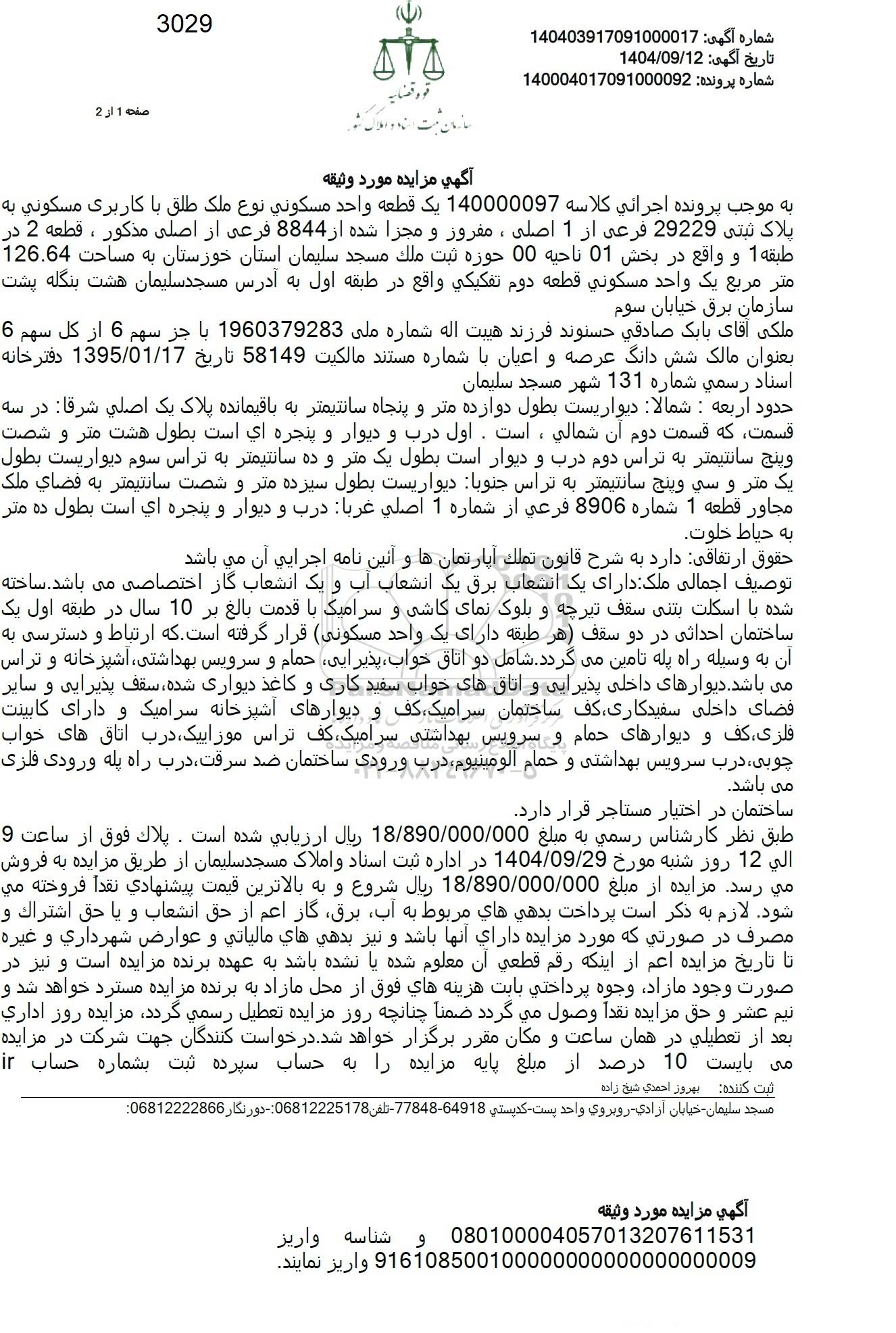 به موجب پرونده اجرائی كلاسه 140000097 یک قطعه واحد مسکونی نوع ملک طلق با کاربری مسکونی به پلاک ثبتی 29229 فرعی از 1 اصلی ، مفروز و مجزا شده از 8844 فرعی از اصلی مذکور ، قطعه 2 در طبقه 1 و واقع در بخش 01 ناحیه 00 حوزه ثبت ملك مسجد سلیمان استان خوزستان به مساحت 126.64 متر مربع یک واحد مسكونی قطعه دوم تفكیكی واقع در طبقه اول به آدرس مسجد سلیمان هشت بنگله پشت سازمان برق خیابان سوم
