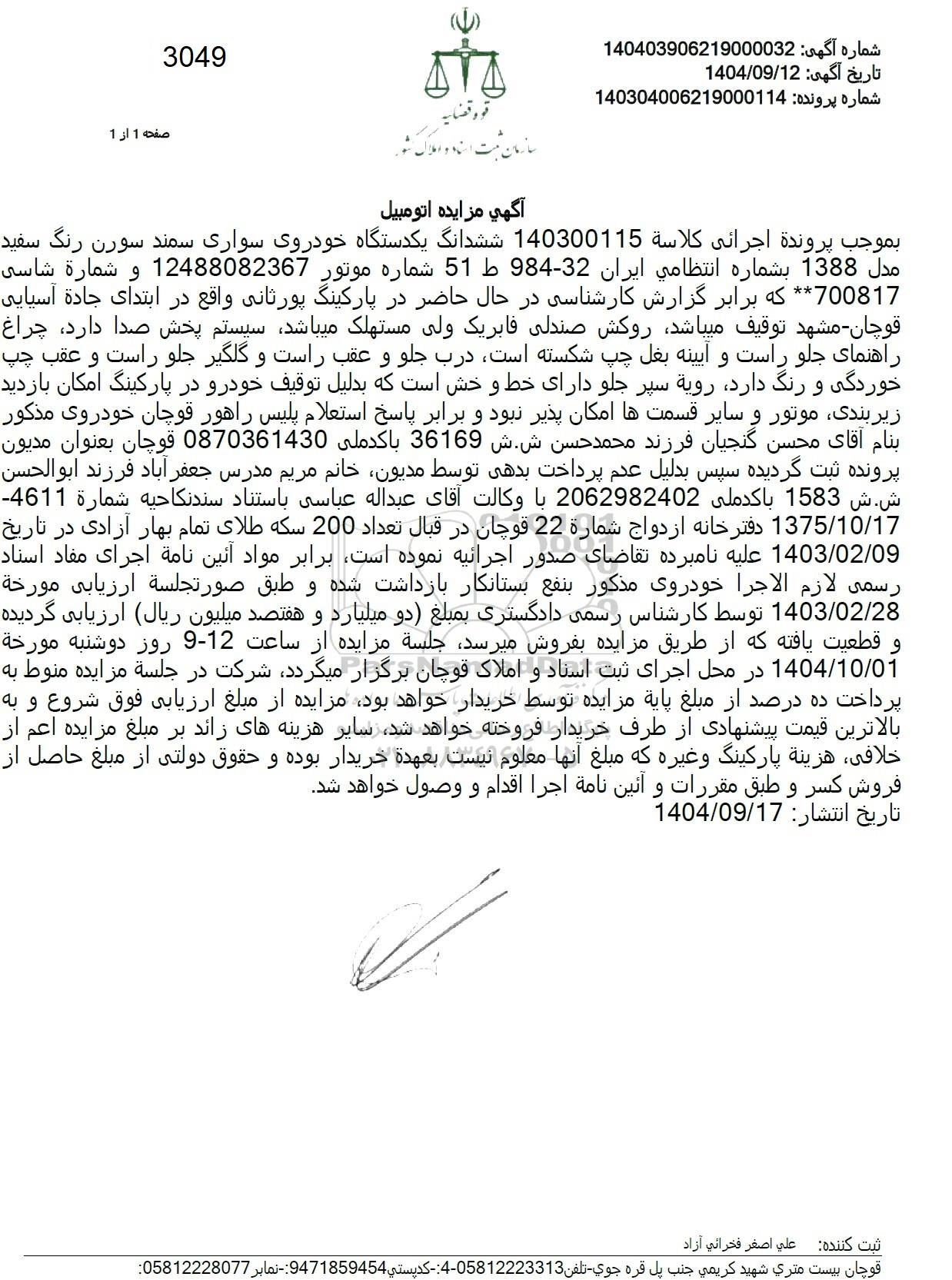 بموجب پرونده اجرائي كلاسة 140300115 ششدانگ یکدستگاه خودروی سواری سمند سورن رنگ سفید مدل 1388 بشماره انتظامی ایران 32-984 ط 51 شماره موتور 12488082367 و شماره شاسی 700817 که برابر گزارش کارشناسی در حال حاضر در پارکینگ پورثانی واقع در ابتدای جاده آسیایی قوچان - مشهد توقیف میباشد روکش صندلی فابریک ولی مستهلک میباشد سیستم پخش صدا دارد، چراغ راهنمای جلو راست و آیینه بغل چپ شکسته است درب جلو و عقب راست و گلگیر جلو راست و عقب چپ خوردگی و رنگ دارد روية سپر جلو دارای خط و خش است که بدلیل توقیف خودرو در پارکینگ امکان بازدید زیربندی موتور و سایر قسمتها امکان پذیر نبود و برابر پاسخ استعلام پلیس راهور قوچان خودروی مذکور بنام آقای محسن گنجیان فرزند محمد حسن شش 36169 باکدملی 0870361430 قوچان بعنوان مدیون پرونده ثبت گردیده سپس بدلیل عدم پرداخت بدهی توسط مدیون خانم مریم مدرس جعفرآباد فرزند ابوالحسن شش 1583 با کدملی 2062982402 با وکالت آقای عبداله عباسی باستناد سندنكاحيه شمارة 4611 1375/10/17 دفتر خانه ازدواج شماره 22 قوچان در قبال تعداد 200 سکه طلای تمام بهار آزادی در تاریخ 1403.02.09 عليه نامبرده تقاضای صدور اجرائیه نموده است برابر مواد آئین نامه اجرای مقاد اسناد رسمی لازم الاجرا خودروی مذکور بنفع بستانکار بازداشت شده و طبق صورتجلسة ارزيابي مورخة 1403.02.28 توسط کارشناس رسمی دادگستری بمبلغ دو میلیارد و هفتصد میلیون ریال ارزیابی گردیده و قطعیت یافته که از طریق مزایده بفروش میرسد جلسة مزایده از ساعت 12-9 روز دوشنبه مورخة 1404.10.01 در محل اجرای ثبت اسناد و املاک قوچان برگزار میگردد شرکت در جلسه مزایده منوط به پرداخت ده درصد از مبلغ پاية مزایده توسط خریدار خواهد بود مزایده از مبلغ ارزیابی فوق شروع و به بالاترین قیمت پیشنهادی از طرف خریدار فروخته خواهد شد سایر هزینه های زائد بر مبلغ مزایده اعم از خلافی هزینه پارکینگ و غیره که مبلغ آنها معلوم نيست بعهده خریدار بوده و حقوق دولتی از مبلغ حاصل از فروش کسر و طبق مقررات و آئین نامه اجرا اقدام و وصول خواهد شد. 1404/09/17 :تاریخ انتشار