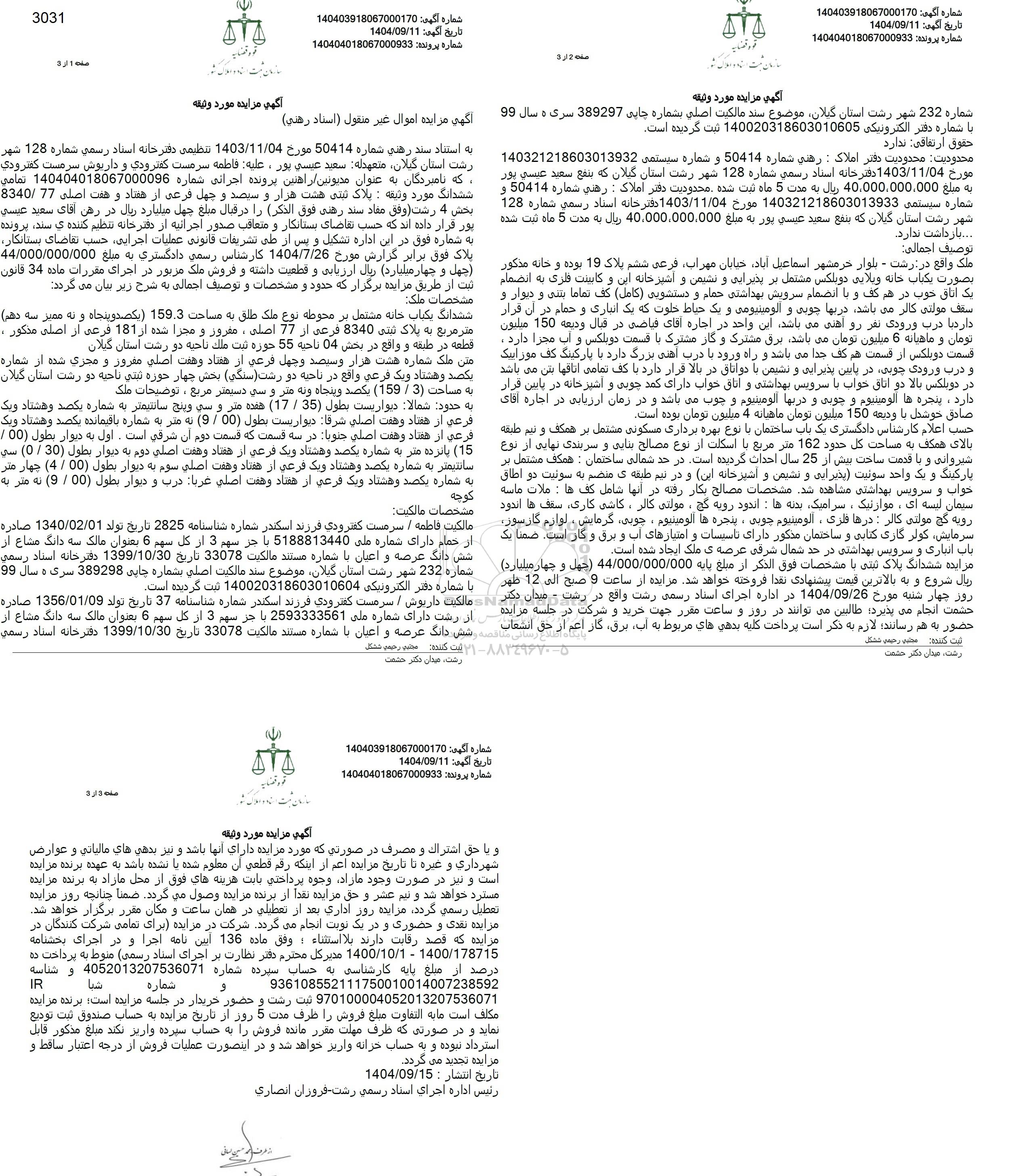 تاریخ مزایده از ساعت 9 صبح الی 12 ظهر روز 4شنبه مورخ 1404.09.26 در اداره اجرای اسناد رسمی رشت واقع در رشت - میدان دکتر حشمت