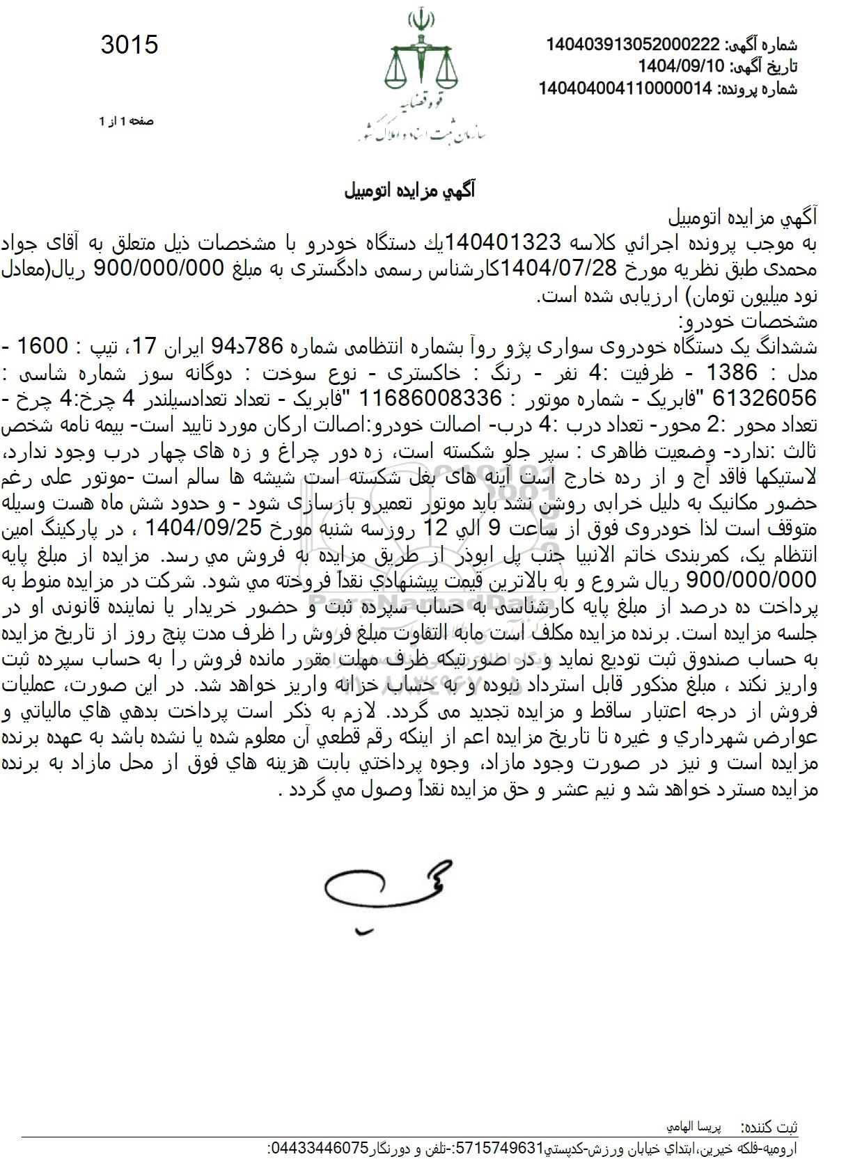 به موجب پرونده اجرائي كلاسه 140401323 يك دستگاه خودرو با مشخصات ذیل متعلق به آقای جواد محمدی طبق نظریه مورخ 1404/07/28 کارشناس رسمی دادگستری به مبلغ 900/000/000 ريال (معادل نود میلیون تومان ارزیابی شده است.