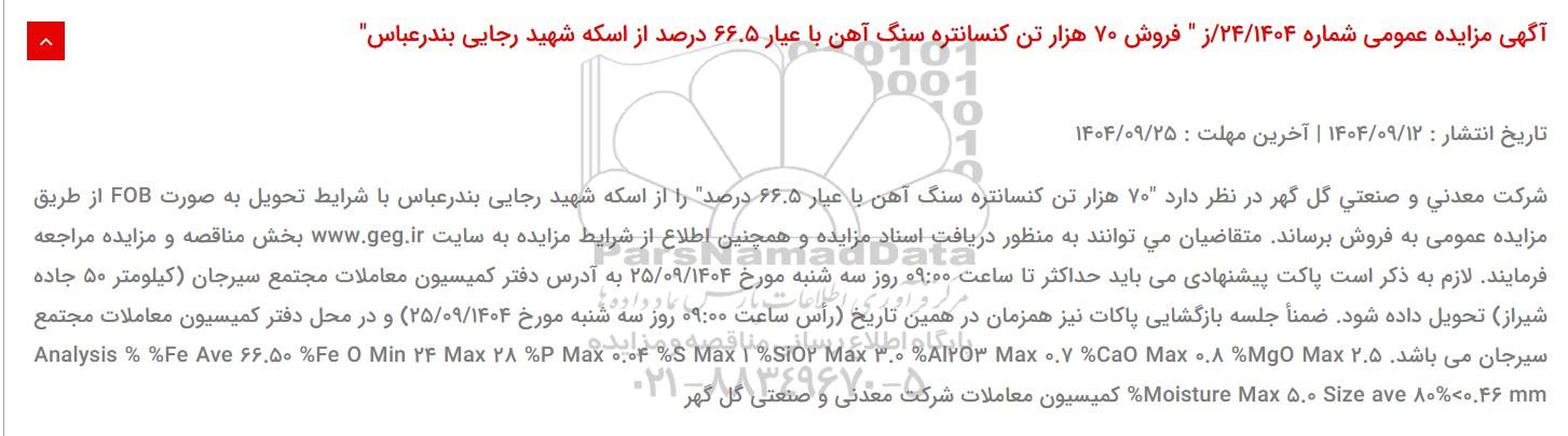 شرکت معدنی و صنعتی گل گهر در نظر دارد 70 هزار تن کنسانتره سنگ آهن با عیار 66.5 درصد را از اسکله شهید رجایی بندرعباس با شرایط تحویل به صورت FBO از طریق مزایده عمومی به فروش برساند. متقاضیان می توانند به منظور دریافت اسناد مزایده و همچنین اطلاع از شرایط مزایده به سایت WWW.GEG.IR بخش مناقصه و مزایده مراجعه نمایند.