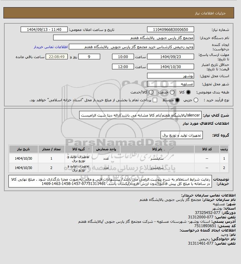 شرح کلی نیاز: silencer/پالایشگاه هفتم/نام کالا مشابه می باشد/ارائه دیتا شیت الزامیست