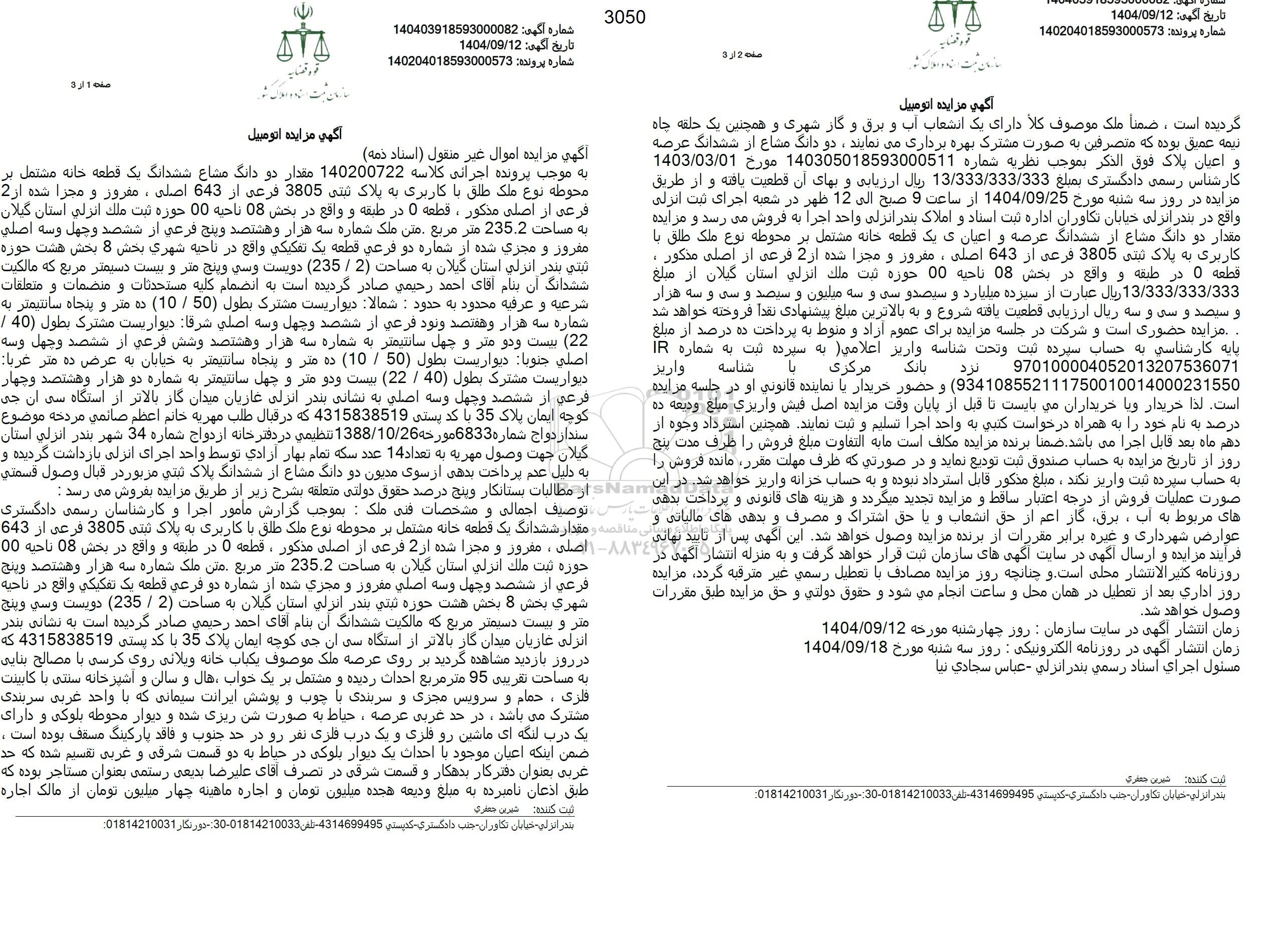 گردیده است. ضمنا ملک موصوف کلا دارای یک انشعاب آب و برق و گاز شهری و همچنین یک حلقه چاه نیمه عمیق بوده که متصرفین به صورت مشترک بهره برداری می نمایند، دو دانگ مشاع از ششدانگ عرصه و اعیان پلاك فوق الذكر بموجب نظریه شماره 140305018593000511 مورخ 1403.03.01 کارشناس رسمی دادگستری بمبلغ 13.333.333.333 ریال ارزیابی و بهای آن قطعیت یافته و از طریق مقدار دو دانگ مشاع از ششدانگ عرصه و اعیانی یک قطعه خانه مشتمل بر محوطه نوع ملک طلق با مزایده در روز سه شنبه مورخ 1404.09.25 از ساعت 9 صبح الی 12 ظهر در شعبه اجرای ثبت انزلی واقع در بندر انزلی خیابان تکاوران اداره ثبت اسناد و املاک بندر انزلی واحد اجرا به فروش می رسد و مزایده 13.333.333.333 ریال عبارت از سیزده میلیارد و سیصد و سی و سه میلیون و سیصد و سی و سه هزار و سیصد و سی و سه ریال ارزیابی قطعیت یافته شروع و به بالاترین مبلغ پیشنهادی نقدا فروخته خواهد شد. مزایده حضوری است و شرکت در جلسه مزایده برای عموم آزاد و منوط به پرداخت ده درصد از مبلغ پایه کارشناسی به حساب سیر سپرده ثبت و تحت شناسه واریز اعلامی به سپرده ثبت به شماره IR بانک مرکزی شناسه وارير کاربری به پلاک ثبتی 3805 فرعی از 643 اصلی، مغرور و مجزا شده از 2 فرعی از اصلی مذکور ، قطعه 0 در طبقه و واقع در بخش 08 ناحیه 00 حوزه ثبت ملك انزلی استان گیلان از مبلغ نزد L 970100004052013207536071 934108552111750010014000231550) و حضور خریدار با نماینده قانونی او در جلسه مزایده است. لذا خریدار و با خریداران می بایست تا قبل از پایان وقت مزایده اصل فیش واريزي مبلغ ودیعه ده درصد به نام خود را به همراه درخواست کتبي به واحد اجرا تسلیم و ثبت نمایند. همچنین استرداد وجوه از دهم ماه بعد قابل اجرا می باشد. ضمنا برنده مزایده مکلف است مابه التفاوت مبلغ فروش را ظرف مدت پنج روز از تاریخ مزایده به حساب صندوق ثبت تودیع نماید و در صورتی که ظرف مهلت مقرر مانده فروش را به حساب سپرده ثبت واریز نکند، مبلغ مذکور قابل استرداد نبوده و به حساب خزانه واریز خواهد شد. در این صورت عملیات فروش از درجه اعتبار ساقط و مزایده تجدید میگردد و هزینه های قانونی و پرداخت بدهی های مربوط به آب برق گاز اعم از حق انشعاب و با حق اشتراک و مصرف و بدهی های مالیاتی و عوارض شهرداری و غیره برابر مقررات از برنده مزایده وصول خواهد شد. این آگهی پس از تایید نهایی فرآیند مزایده و ارسال آگهی در سایت آگهی های سازمان ثبت قرار خواهد گرفت و به منزله انتشار آگهی در روزنامه کثیر الانتشار محلی است و چنانچه روز مزایده مصادف با تعطیل رسمي غير مترقبه گردد. مزایده روز اداری بعد از تعطیل در همان محل و ساعت انجام میشود و حقوق دولتی و حق مزایده طبق مقررات وصول خواهد شد.