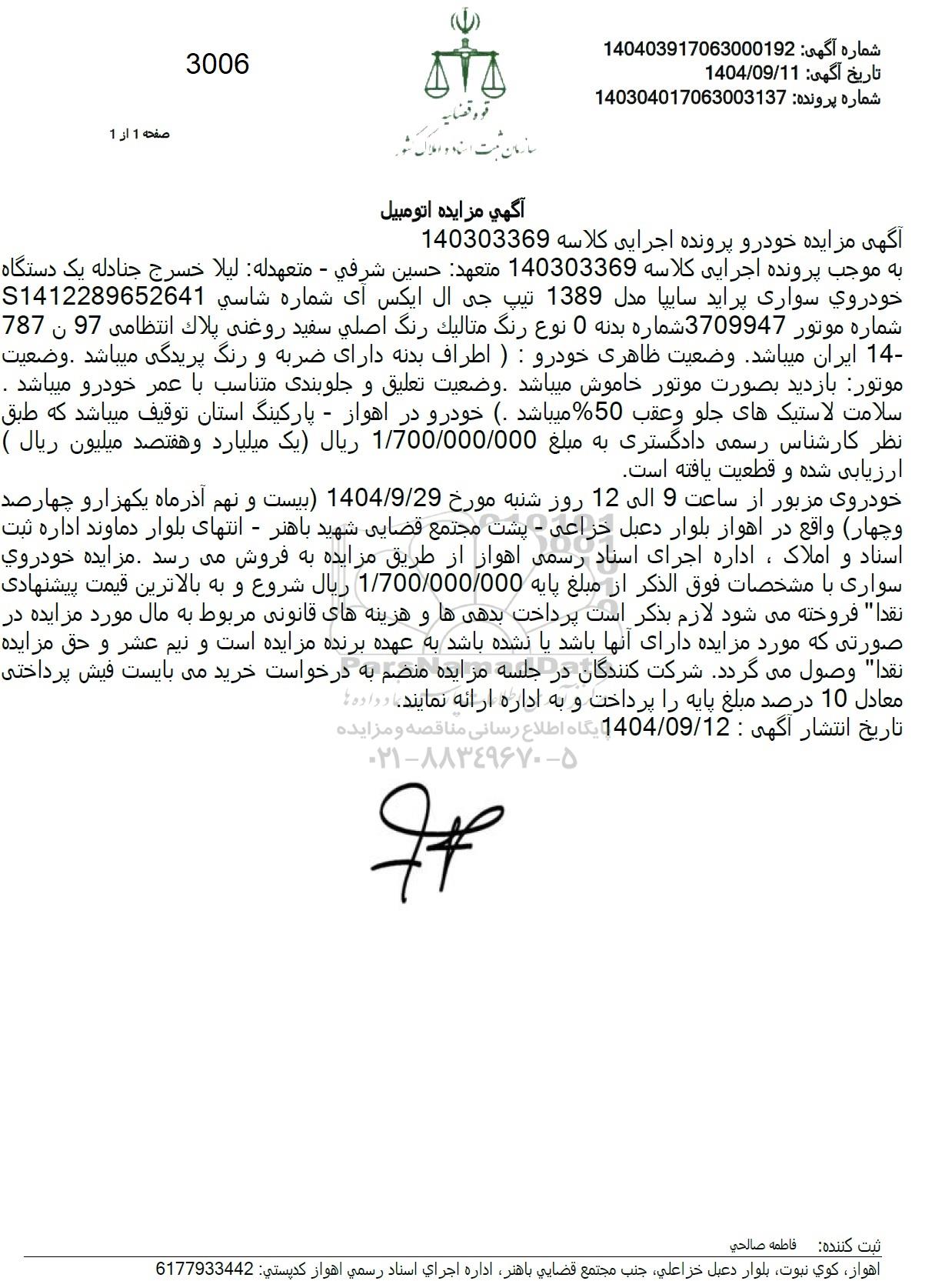 آگهی مزایده خودرو پرونده اجرایی کلاسه 140303369