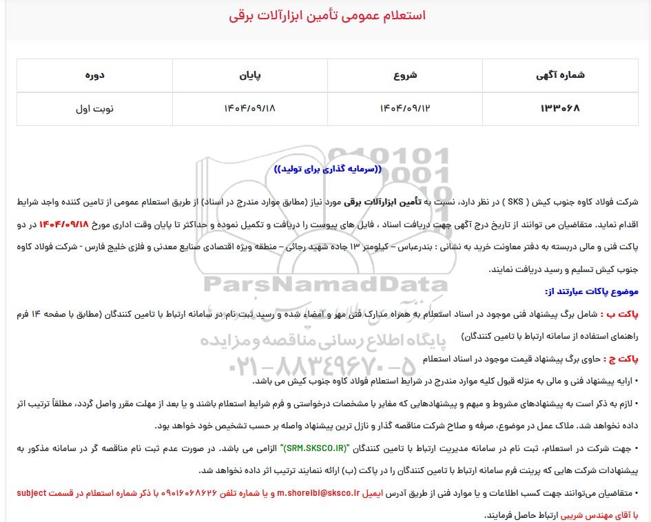 شرکت فولاد کاوه جنوب کیش (SKS) در نظر دارد نسبت به تامین ابزارآلات برقی (مطابق موارد مندرج در اسناد) از طریق استعلام عمومی ریالی از تأمین کننده واجد شرایط اقدام نماید. متقاضیان می توانند از تاریخ درج آگهی جهت دریافت اسناد ، فایلهای پیوست را دریافت و تکمیل نموده و حداکثر تا پایان وقت اداری روز چهارشنبه مورخ 1404.9.26 در دو پاکت فنی و مالی در بسته به دفتر معاونت خرید به نشانی : تهران - میدان آرژانتین - خیابان بخارست - بخارست هشتم - پلاک 30 - شرکت فولاد کاوه جنوب کیش تسلیم و رسید دریافت نمایند.