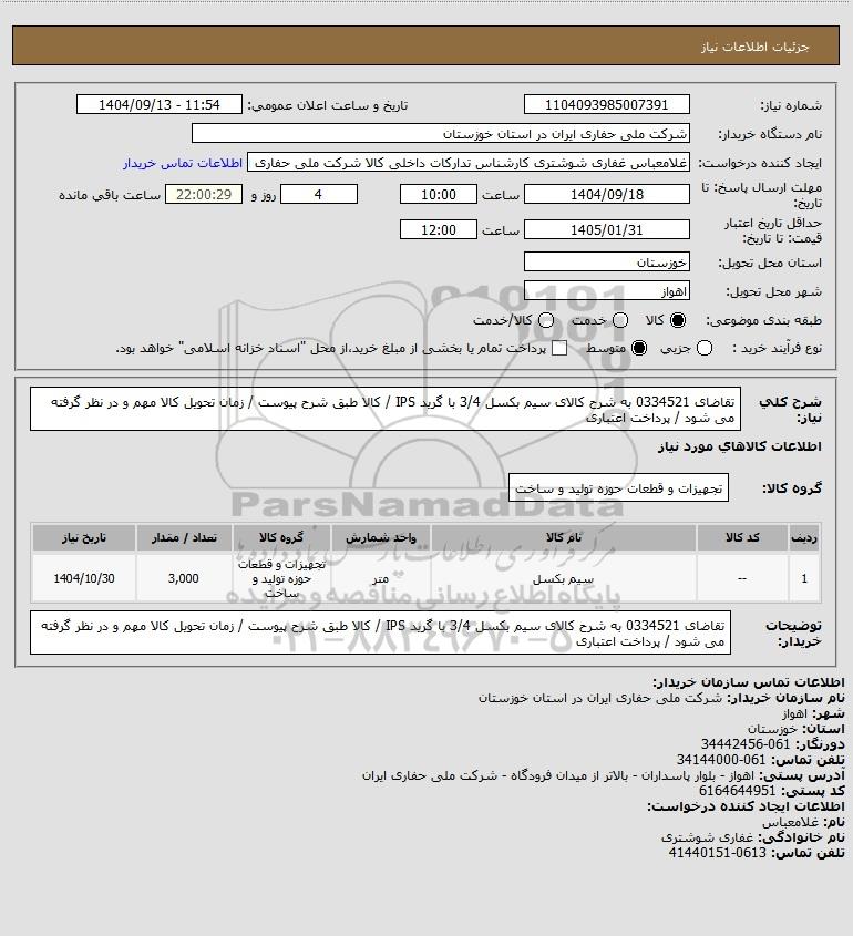 شرح کلی نیاز: تقاضای 0334521 به شرح کالای سیم بکسل 3/4 با گرید IPS / کالا طبق شرح پیوست / زمان تحویل کالا مهم و در نظر گرفته می شود / پرداخت اعتباری