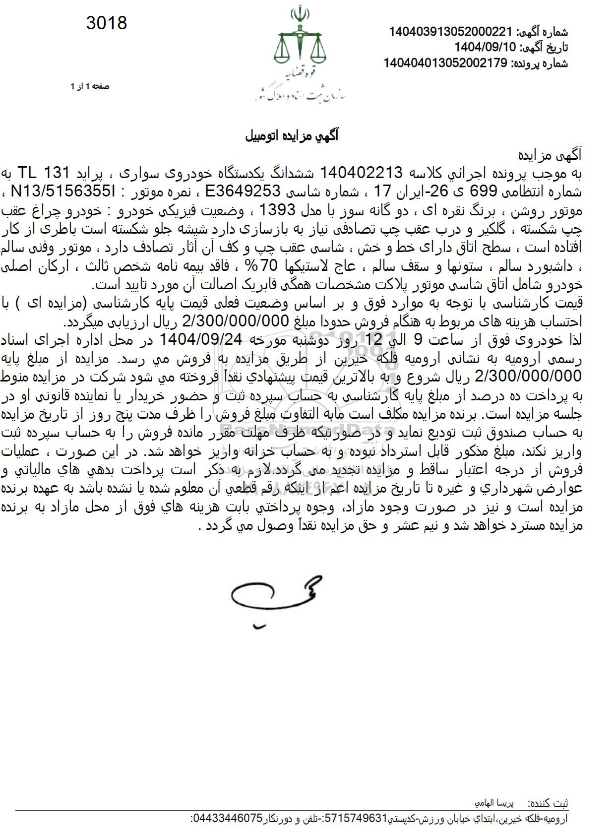 لذا خودروی فوق از ساعت 9 الی 12 روز دوشنبه مورخه 1404.09.24 در محل اداره اجرای اسناد رسمی ارومیه به نشانی ارومیه فلکه خیرین از طریق مزایده به فروش می رسد. مزایده از مبلغ پایه 2.300.000.000 ریال شروع و به بالاترین قیمت پیشنهادی نقدا فروخته می شود شرکت در مزایده منوط به پرداخت ده درصد از مبلغ پایه کارشناسی به حساب سپرده ثبت و حضور خریدار یا نماینده قانونی او در جلسه مزایده است. برنده مزایده مکلف است ما به التفاوت مبلغ فروش را ظرف مدت پنج روز از تاریخ مزایده به حساب صندوق ثبت تودیع نماید و در صورتیکه ظرف مهلت مقرر مانده فروش را به حساب سپرده ثبت واریز نکند مبلغ مذکور قابل استرداد نبوده و به حساب خزانه واریز خواهد شد. در این صورت ، عملیات فروش از درجه اعتبار ساقط و مزایده تجدید میگردد. لازم به ذکر است پرداخت بدهی های مالیاتی و عوارض شهرداری و غیره تا تاریخ مزایده اعم از اینکه رقم قطعی آن معلوم شده یا نشده باشد به عهده برنده مزایده است و نیز در صورت وجود مازاد وجوه پرداختی بابت هزینه های فوق از محل مازاد به برنده مزایده مسترد خواهد شد و نیم عشر و حق مزایده نقداً وصول می گردد .