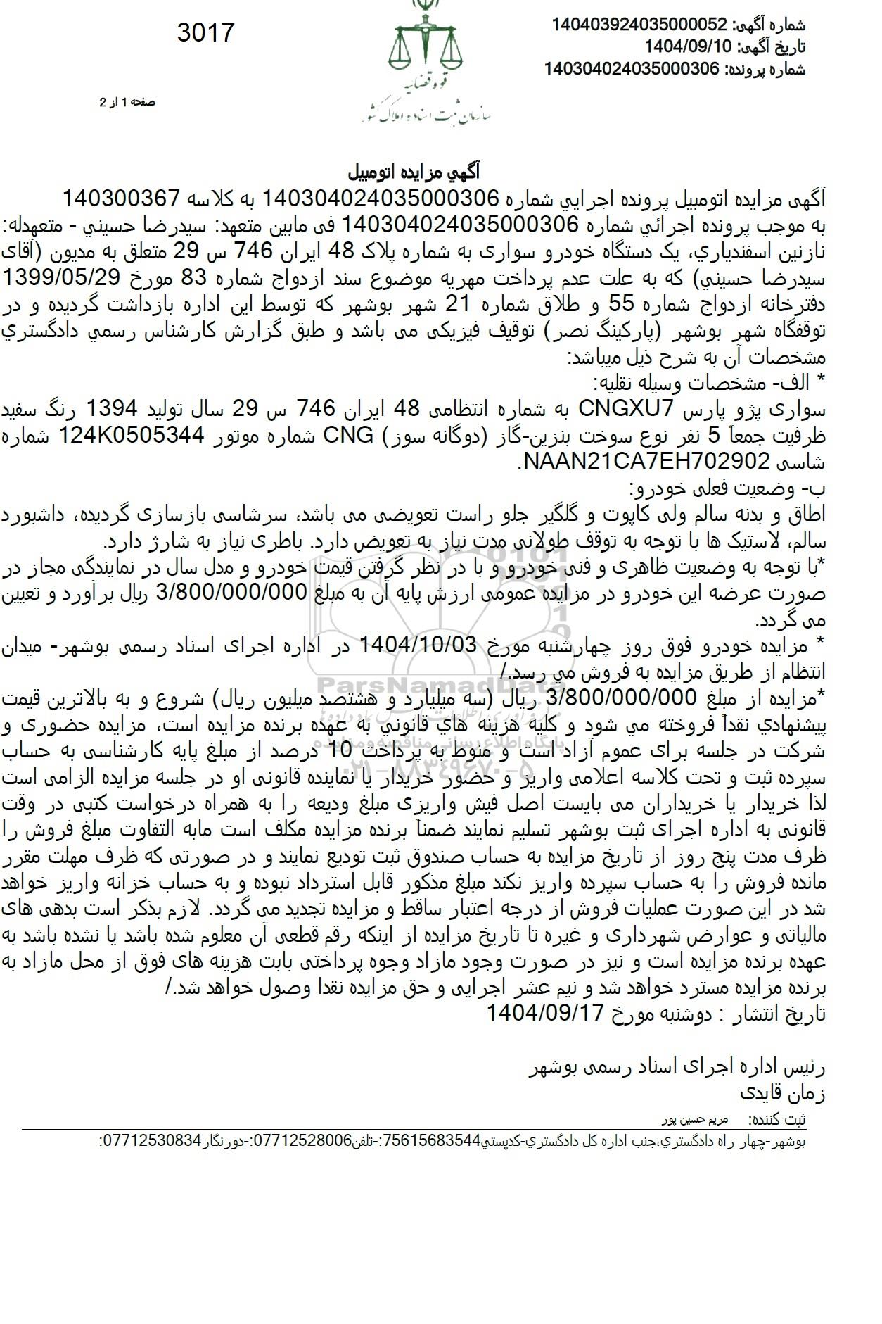 به موجب پرونده اجراني شماره 140304024035000306 في ما بين متعهد سيدرضا حسيني - متعهدله : نازنین اسفندیاری یک دستگاه خودرو سواری به شماره پلاک 48 ایران 746 س 29 متعلق به مدیون آقای سیدرضا حسینی که به علت عدم پرداخت مهریه موضوع سند ازدواج شماره 83 مورخ 1399/05/29 دفترخانه ازدواج شماره 55 و طلاق شماره 21 شهر بوشهر که توسط این اداره بازداشت گردیده و در توقفگاه شهر بوشهر پارکینگ نصر توقیف فیزیکی میباشد و طبق گزارش کارشناس رسمی دادگستري مشخصات آن به شرح ذیل میباشد.