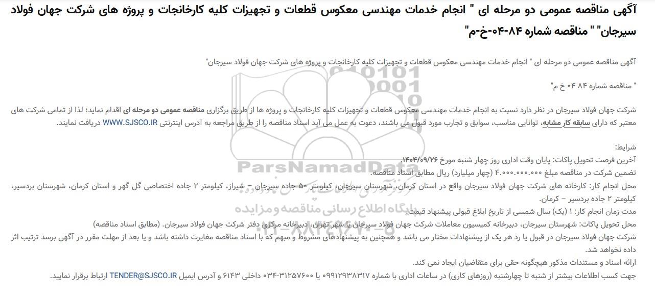 آگهی مناقصه عمومی دو مرحله ای انجام خدمات مهندسی معکوس قطعات و تجهیزات کلیه کارخانجات و پروژه های شرکت جهان فولاد سیرجان"مناقصه شماره 84-04-خ م