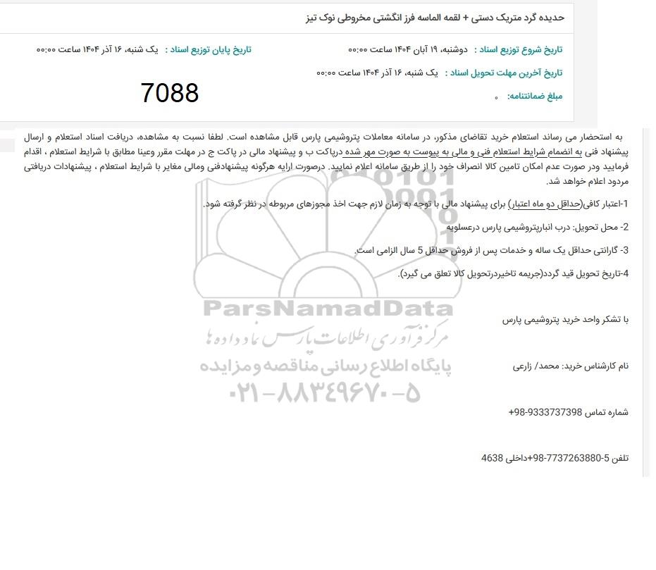 در صورت نیاز به دریافت راهنمایی یا پشتیبانی در خصوص استعلام و مناقصه و فراخوان مناقصه عمومی، مناقصه محدود، مناقصه بین‌ المللی، مناقصه دولتی، مناقصه خصوصی، مناقصه آنلاین فروش تجهیزات، مناقصه مشاوره‌ای مناقصه پتروشیمی و انرژی مناقصه صنایع و تجهیزات برق و مخابرات و نفت و گاز ... لطفاً با سایت خبری مناقصه و مزایده پارس‌نماد داده‌ها به شماره 88349670 تماس حاصل فرمایید.