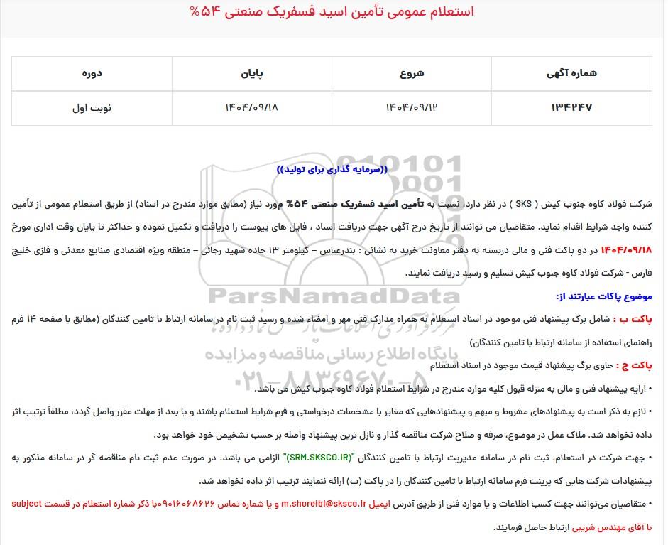 شرکت فولاد کاوه جنوب کیش (SKS) در نظر دارد نسبت به تامین اسید فسفریک 54% موردنیاز (مطابق موارد مندرج در اسناد) از طریق استعلام عمومی ریالی از تأمین کننده واجد شرایط اقدام نماید. متقاضیان می توانند از تاریخ درج آگهی جهت دریافت اسناد ، فایلهای پیوست را دریافت و تکمیل نموده و حداکثر تا پایان وقت اداری روز چهارشنبه مورخ 1404.9.26 در دو پاکت فنی و مالی در بسته به دفتر معاونت خرید به نشانی : تهران - میدان آرژانتین - خیابان بخارست - بخارست هشتم - پلاک 30 - شرکت فولاد کاوه جنوب کیش تسلیم و رسید دریافت نمایند.