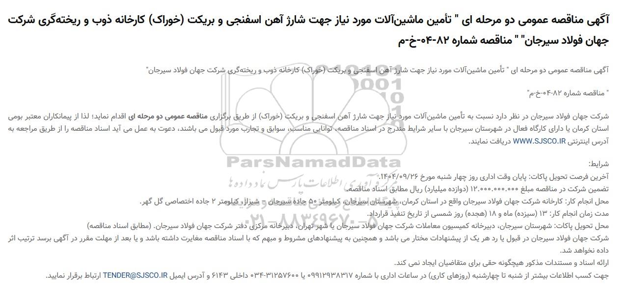 آگهی مناقصه عمومی دو مرحله ای " تأمین ماشین آلات مورد نیاز جهت شارژ آهن اسفنجی و بریکت (خوراک) کارخانه ذوب و ریخته گری شرکت جهان فولاد سیرجان " مناقصه شماره 82-04-خ م