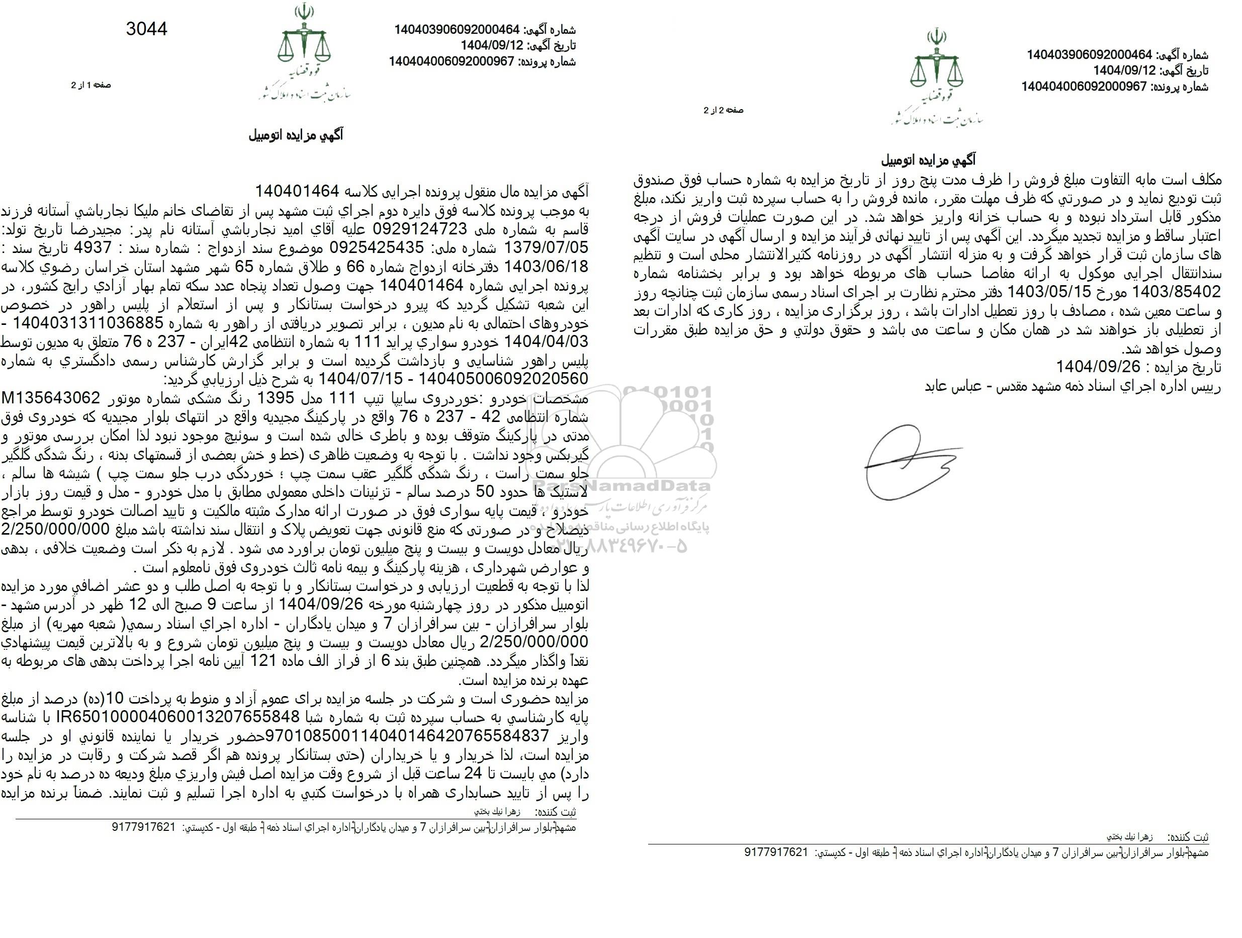 لذا با توجه به قطعیت ارزیابی و درخواست بستانکار و با توجه به اصل طلب و دو عشر اضافی مورد مزایده اتومبیل مذکور در روز چهارشنبه مورخه 1404.09.26 از ساعت 9 صبح الی 12 ظهر در آدرس مشهد -بلوار سرافرازان - بین سرافرازان 7 و میدان یادگاران - اداره اجرای اسناد رسمی ( شعبه مهریه از مبلغ 2.250.000.000 ریال معادل دویست و بیست و پنج میلیون تومان شروع و به بالاترین قیمت پیشنهادی نقدا واگذار میگردد. همچنین طبق بند 6 از فراز الف ماده 121 آیین نامه اجرا پرداخت بدهی های مربوطه به عهده برنده مزایده است.