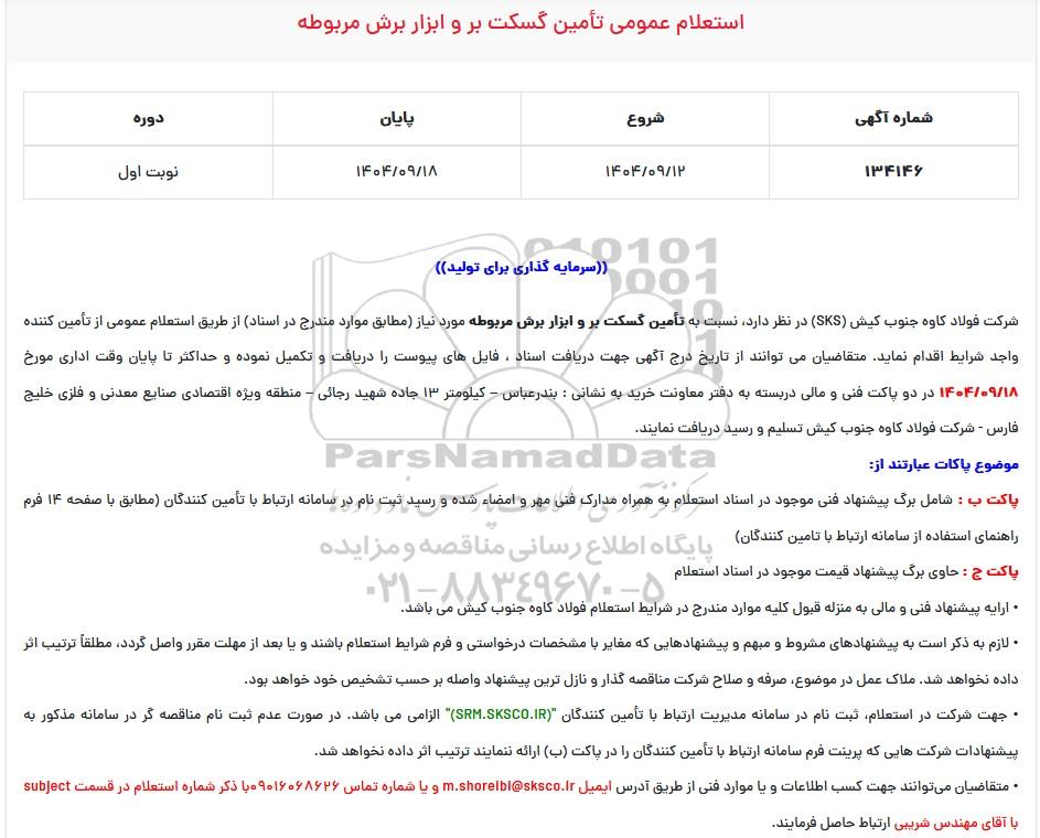 شرکت فولاد کاوه جنوب کیش (SKS) در نظر دارد نسبت به تامین گسکت بر و ابزار برش مربوطه موردنیاز (مطابق موارد مندرج در اسناد) از طریق استعلام عمومی ریالی از تأمین کننده واجد شرایط اقدام نماید. متقاضیان می توانند از تاریخ درج آگهی جهت دریافت اسناد ، فایلهای پیوست را دریافت و تکمیل نموده و حداکثر تا پایان وقت اداری روز چهارشنبه مورخ 1404.9.26 در دو پاکت فنی و مالی در بسته به دفتر معاونت خرید به نشانی : تهران - میدان آرژانتین - خیابان بخارست - بخارست هشتم - پلاک 30 - شرکت فولاد کاوه جنوب کیش تسلیم و رسید دریافت نمایند.