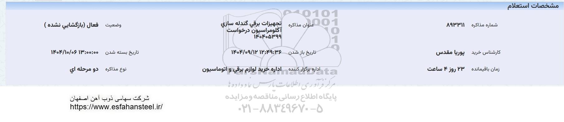 استعلام بها و موضوع استعلام استعلام تجهیزات برقی گندله سازی آگلومراسیون به اطلاع کلیه شرکتها و افراد متخصص واجد شرایط میرساند، آگهی گذار در نظر دارد از طریق استعلام بها، نسبت به انتخاب و دریافت پیشنهادات اقدام نماید. این استعلام با کد آگهی ثبت شده در سامانه خبرگزاری پارس نماد : 9944638 منتشر شده است. مشخصات استعلام : تاریخ شروع استعلام: 1404/09/13 آخرین مهلت ارسال پیشنهاد قیمت : 1404/10/06 و محل اجرای پروژه : استان مناقصات استان اصفهان میباشد. استعلام قیمت مورد درخواست : استعلام تجهیزات برقی گندله سازی آگلومراسیون با دستهبندیهای تخصصی و گروه های مرتبط : ساخت،نصب و تعمیرات صنایع فولاد, اتوماسیون ، مراکز کنترل صنعتی, تجهیزات و ماشین آلات صنعتی, تجهیزات برق و الکترونیک, استعلام اطلاع رسانی میگردد.