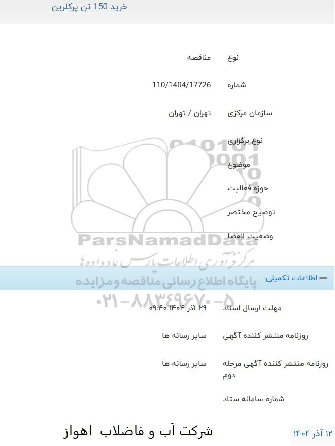 مناقصه خرید 150 تن پرکلرین از کلیه افراد متخصص و شرکتها واجد شرایط دعوت به عمل میآید در مناقصه با کد خبرگزاری پارس نماد: 9944639 شرکت نمایند.