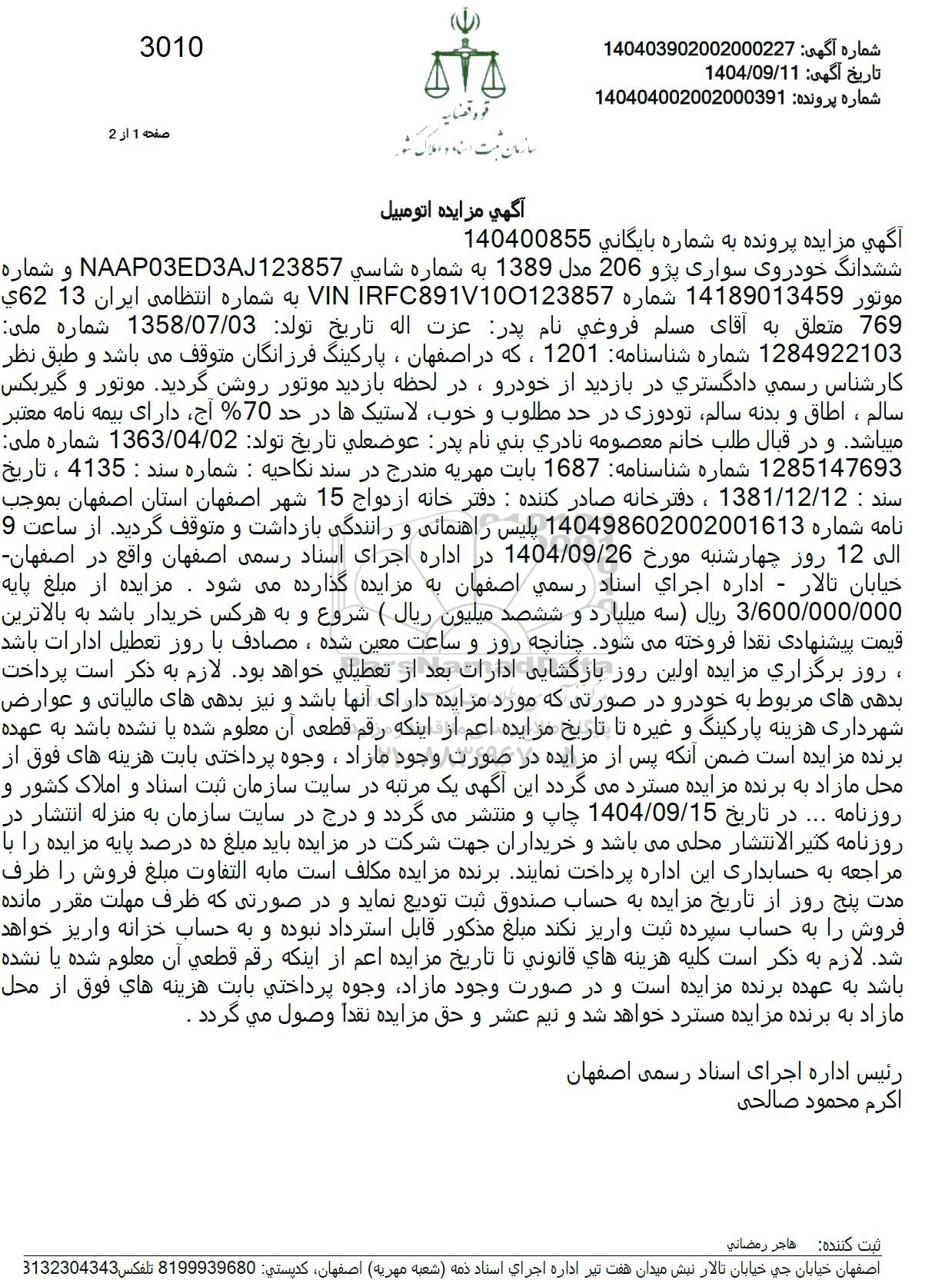 ششدانگ خودروی سواری پژو 206 مدل 1389 به شماره شاسی NAAP03ED3AJ123857 و شماره 62 13 به شماره انتظامی ایران VIN IRFC891V100123857 موتور 14189013459 شماره 769 متعلق به آقای مسلم فروغی نام پدر عزت اله تاریخ تولد: 1358/07/03 شماره ملی 1284922103 شماره شناسنامه 1201 ، که در اصفهان ، پارکینگ فرزانگان متوقف می باشد و طبق نظر کارشناس رسمی دادگستری در بازدید از خودرو، در لحظه بازدید موتور روشن گردید. موتور و گیربکس سالم ، اطاق و بدنه سالم تو دوزی در حد مطلوب و خوب لاستیکها در حد 70% ،آج دارای بیمه نامه معتبر میباشد و در قبال طلب خانم معصومه نادری بنی نام پدر عوضعلی تاریخ تولد : 1363/04/02 شماره ملی 1285147693 شماره شناسنامه 1687 بابت مهریه مندرج در سند نکاحیه : شماره سند : 4135 ، تاریخ سند : 1381/12/12 ، دفترخانه صادر کننده : دفتر خانه ازدواج 15 شهر اصفهان استان اصفهان بموجب نامه شماره 140498602002001613 پلیس راهنمائی و رانندگی بازداشت و متوقف گردید. از ساعت 9 الی 12 روز چهارشنبه مورخ 1404.09.26 در اداره اجرای اسناد رسمی اصفهان واقع در اصفهان خیابان تالار - اداره اجرای اسناد رسمی اصفهان به مزایده گذارده میشود. مزایده از مبلغ پایه 3.600.000.000 ریال سه میلیارد و ششصد میلیون ریال ( شروع و به هر کس خریدار باشد به بالاترین قیمت پیشنهادی نقدا فروخته میشود چنانچه روز و ساعت معین شده ، مصادف با روز تعطیل ادارات باشد ، روز برگزاری مزایده اولین روز بازگشایی ادارات بعد از تعطیلی خواهد بود. لازم به ذکر است پرداخت بدهی های مربوط به خودرو در صورتی که مورد مزایده دارای آنها باشد و نیز بدهی های مالیاتی و عوارض شهرداری هزینه پارکینگ و غیره تا تاریخ مزایده اعم از اینکه رقم قطعی آن معلوم شده یا نشده باشد به عهده برنده مزایده است ضمن آنکه پس از مزایده در صورت وجود مازاد ، وجوه پرداختی بابت هزینه های فوق از محل مازاد به برنده مزایده مسترد میگردد این آگهی یک مرتبه در سایت سازمان ثبت اسناد و املاک کشور و روزنامه ... در تاریخ 1404.09.15 چاپ و منتشر میگردد و درج در سایت سازمان به منزله انتشار در روزنامه کثیر الانتشار محلی میباشد و خریداران جهت شرکت در مزایده باید مبلغ ده درصد پایه مزایده را با مراجعه به حسابداری این اداره پرداخت نمایند برنده مزایده مکلف است ما به التفاوت مبلغ فروش را ظرف مدت پنج روز از تاریخ مزایده به حساب صندوق ثبت تودیع نماید و در صورتی که ظرف مهلت مقرر مانده فروش را به حساب سپرده ثبت واریز نکند مبلغ مذکور قابل استرداد نبوده و به حساب خزانه واریز خواهد شد. لازم به ذکر است کلیه هزینه های قانونی تا تاریخ مزایده اعم از اینکه رقم قطعی آن معلوم شده یا نشده باشد به عهده برنده مزایده است و در صورت وجود مازاد وجوه پرداختی بابت هزینه های فوق از محل مازاد به برنده مزایده مسترد خواهد شد و نیم عشر و حق مزایده نقدا وصول می گردد .
