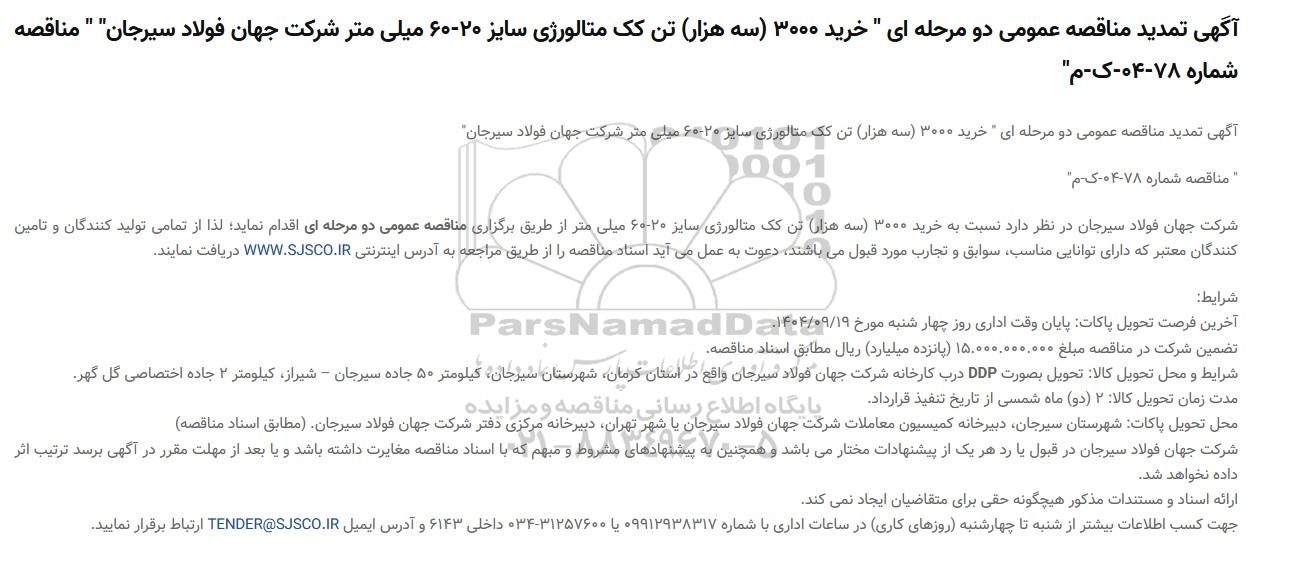 تمدید مناقصه خرید 3000 (سه هزار) تن کک متالوژی از کلیه افراد متخصص و شرکتها واجد شرایط دعوت به عمل میآید در مناقصه با کد خبرگزاری پارس نماد: 9944645 شرکت نمایند.