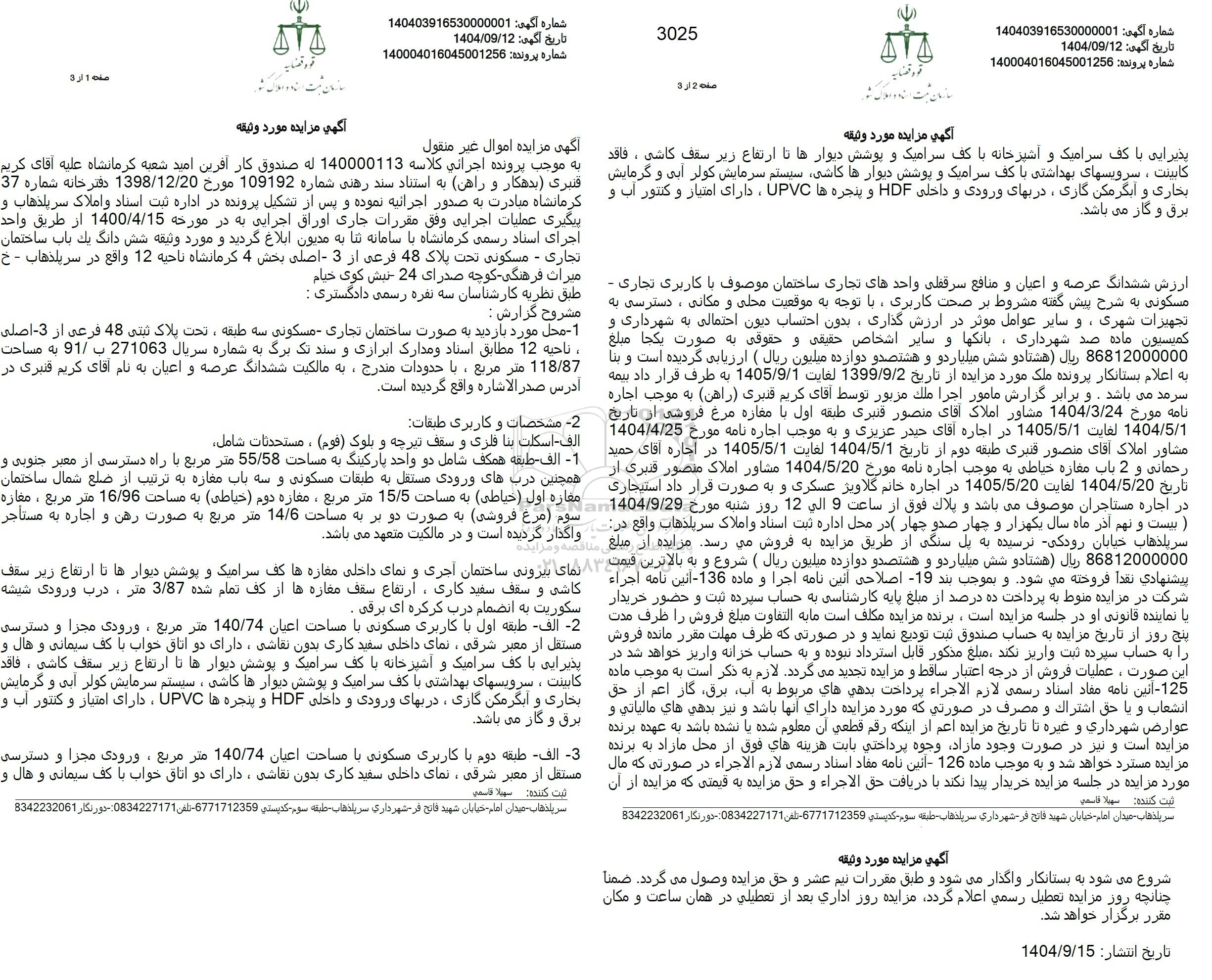 آگهی مزایده اموال غیر منقولبه موجب پرونده اجرائي كلاسه 140000113 له صندوق کار آفرین امید شعبه کرمانشاه علیه آقای کریم قنبری بدهکار) و (راهن به استناد سند رهنی شماره 109192 مورخ 1398.12.20 دفترخانه شماره 37 کرمانشاه مبادرت به صدور اجرائیه نموده و پس از تشکیل پرونده در اداره ثبت اسناد و املاک سرپلذهاب و پیگیری عملیات اجرایی وفق مقررات جاری اوراق اجرایی به در مورخه 1400.4.15 از طریق واحد اجرای اسناد رسمی کرمانشاه با سامانه ثنا به مدیون ابلاغ گردید و مورد وثیقه شش دانگ یک باب ساختمان تجاری - مسکونی تحت پلاک 48 فرعی از 3 اصلی بخش 4 کرمانشاه ناحیه 12 واقع در سرپلذهاب - خ میراث فرهنگی - کوچه صدرای 24 - نبش کوی خیام طبق نظریه کارشناسان سه نفره رسمی دادگستری :مشروح گزارش :1 - محل مورد بازدید به صورت ساختمان تجاری مسکونی سه طبقه ، تحت پلاک ثبتی 48 فرعی از 3 اصلی ، ناحيه 12 مطابق اسناد و مدارک ابرازی و سند تک برگ به شماره سریال 271063 ب 91 به مساحت 118.87 متر مربع ، با حدودات مندرج ، به مالکیت ششدانگ عرصه و اعیان به نام آقای کریم قنبری در آدرس صدر الاشاره واقع گردیده است.-2 مشخصات و کاربری طبقاتالف - اسکلت بنا فلزی و سقف تیرچه و بلوک (فوم) ، مستحدثات شامل1 - الف - طبقه همکف شامل دو واحد پارکینگ به مساحت 55.58 متر مربع با راه دسترسی از معبر جنوبی و همچنین دربهای ورودی مستقل به طبقات مسکونی و سه باب مغازه به ترتیب از ضلع شمال ساختمان مغازه اول (خیاطی) به مساحت 15.5 متر مربع ، مغازه دوم (خیاطی) به مساحت 16.96 متر مربع ، مغازه سوم مرغ فروشی به صورت دو بر به مساحت 14.6 متر مربع به صورت رهن و اجاره به مستأجر واگذار گردیده است و در مالکیت متعهد می باشد.نمای بیرونی ساختمان آجری و نمای داخلی مغازه ها کف سرامیک و پوشش دیوارها تا ارتفاع زیر سقف کاشی و سقف سفید کاری ، ارتفاع سقف مغازه ها از کف تمام شده 3.87 متر ، درب ورودی شیشه سکوریت به انضمام درب کرکره ای برقی