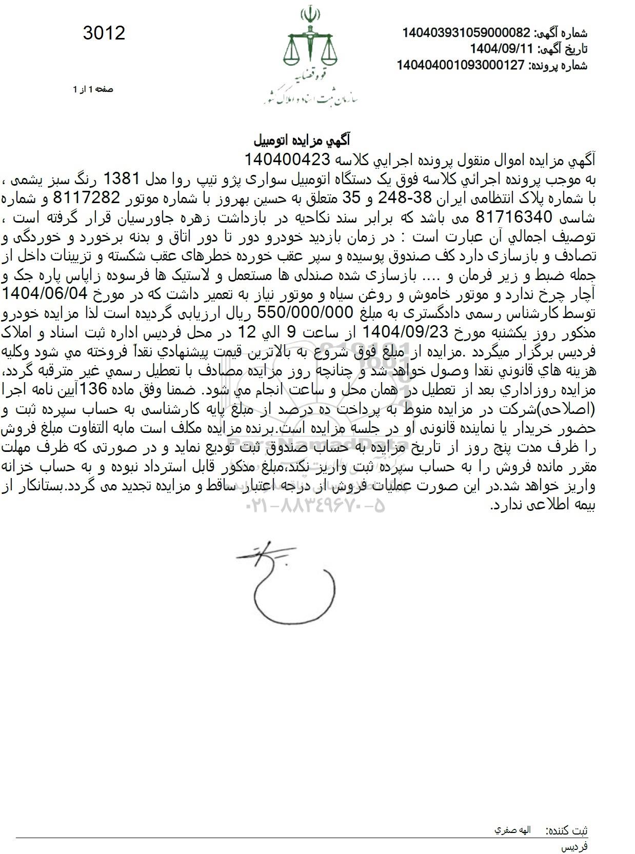 به موجب پرونده اجرائی کلاسه فوق یک دستگاه اتومبیل سواری پژو تیپ روا مدل 1381 رنگ سبز یشمی ، با شماره پلاک انتظامی ایران 38-248 و 35 متعلق به حسین بهروز با شماره موتور 8117282 و شماره شاسی 81716340 میباشد که برابر سند نکاحیه در بازداشت زهره جاورسیان قرار گرفته است ، توصیف اجمالی أن عبارت است: در زمان بازدید خودرو دور تا دور اتاق و بدنه برخورد و خوردگی و تصادف و بازسازی دارد کف صندوق پوسیده و سپر عقب خورده خطرهای عقب شکسته و تزیینات داخل از جمله ضبط و زیر فرمان و .... بازسازی شده صندلی ها مستعمل و لاستیک ها فرسوده زاپاس پاره جک و آچار چرخ ندارد و موتور خاموش و روغن سیاه و موتور نیاز به تعمیر داشت که در مورخ 1404.06.04 توسط کارشناس رسمی دادگستری به مبلغ 550.000.000 ریال ارزیابی گردیده است لذا مزایده خودرو مذکور روز یکشنبه مورخ 1404.09.23 از ساعت 9 الی 12 در محل فردیس اداره ثبت اسناد و املاک فردیس برگزار میگردد. مزایده از مبلغ فوق شروع به بالاترین قیمت پیشنهادی نقداً فروخته می شود و کلیه هزینه های قانونی نقدا وصول خواهد شد و چنانچه روز مزایده مصادف با تعطیل رسمی غیر مترقبه گردد مزایده روز اداری بعد از تعطیل در همان محل و ساعت انجام میشود. ضمنا وفق ماده 136 آیین نامه اجرا (اصلاحی) شرکت در مزایده منوط به پرداخت ده درصد از مبلغ پایه کارشناسی به حساب سپرده ثبت و حضور خریدار یا نماینده قانونی او در جلسه مزایده است. برنده مزایده مکلف است ما به التفاوت مبلغ فروش را ظرف مدت پنج روز از تاریخ مزایده به حساب صندوق ثبت تودیع نماید و در صورتی که ظرف مهلت مقرر مانده فروش را به حساب سپرده ثبت واریز نکند مبلغ مذکور قابل استرداد نبوده و به حساب خزانه واریز خواهد شد. در این صورت عملیات فروش از درجه اعتبار ساقط و مزایده تجدید می گردد. بستانکار از بیمه اطلاعی ندارد.