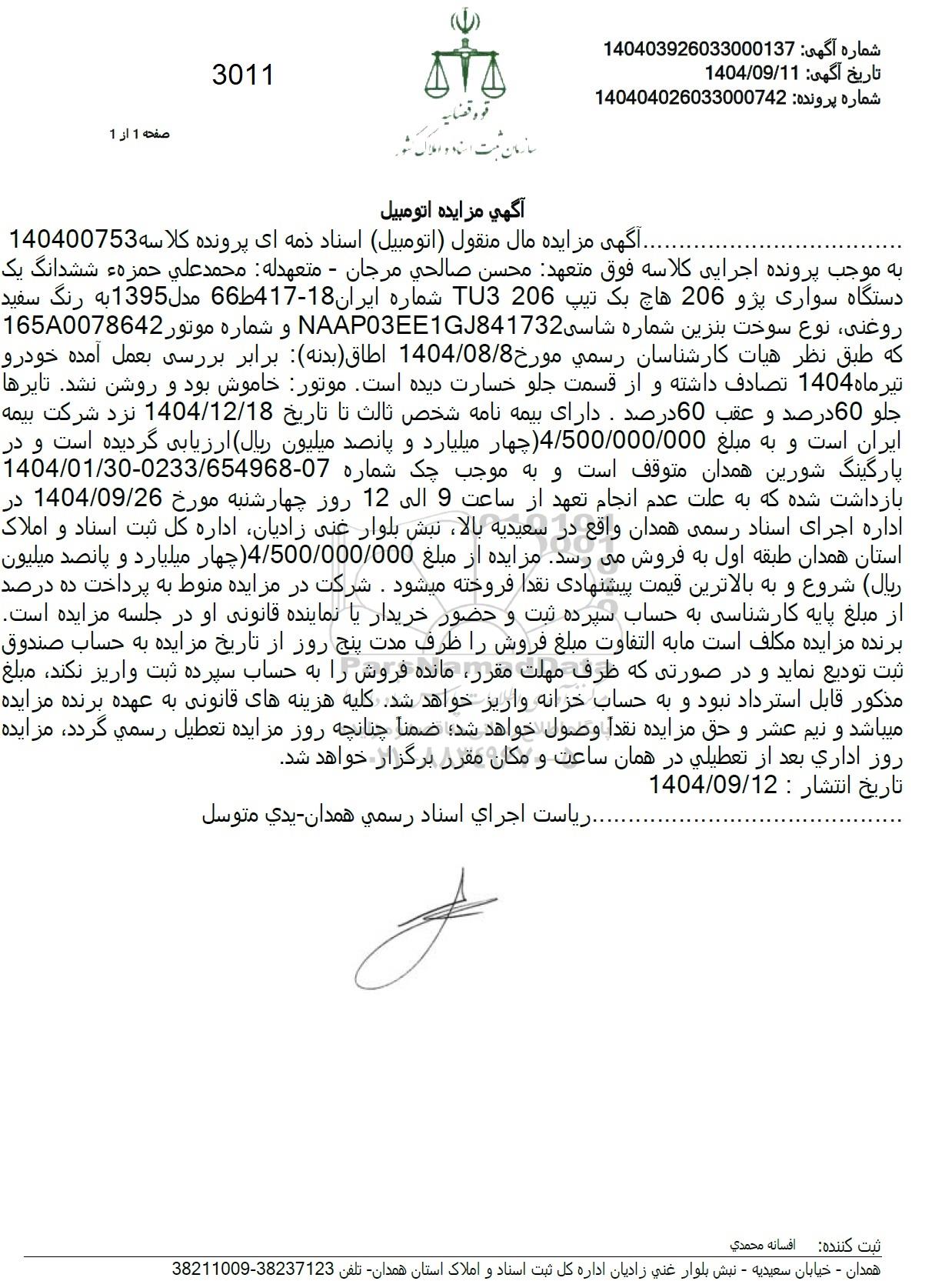 آگهی مزایده مال منقول (اتومبیل) اسناد ذمه ای پرونده کلاسه 140400753 به موجب پرونده اجرایی کلاسه فوق متعهد محسن صالحی مرجان - متعهدله : محمد علی حمزه ششدانگ یک دستگاه سواری پژو 206 هاچ بک تیپ 206 TU3 شماره ایران 18-66417 مدل 1395 به رنگ سفید روغنی نوع سوخت بنزین شماره شاسی NAAP03EE1GJ841732 و شماره موتور 165A0078642 که طبق نظر هیات کارشناسان رسمی مورخ 1404.08.8 اطاق (بدنه) برابر بررسی بعمل آمده خودرو تیر ماه 1404 تصادف داشته و از قسمت جلو خسارت دیده است. موتور خاموش بود و روشن نشد. تایرها جلو 60 درصد و عقب 60 درصد . دارای بیمه نامه شخص ثالث تا تاریخ 1404.12.18 نزد شرکت بیمه ایران است و به مبلغ 4/500/000/000 چهار میلیارد و پانصد میلیون ریال ارزیابی گردیده است و در پارگینگ شورین همدان متوقف است و به موجب چک شماره 07-0233/654968-1404/01/30 بازداشت شده که به علت عدم انجام تعهد از ساعت 9 الی 12 روز چهارشنبه مورخ 1404.09.26 در اداره اجرای اسناد رسمی همدان واقع در سعیدیه بالا نبش بلوار غنی زادیان اداره کل ثبت اسناد و املاک استان همدان طبقه اول به فروش میرسد. مزایده از مبلغ 4.500.000.000 (چهار میلیارد و پانصد میلیون ریال) شروع و به بالاترین قیمت پیشنهادی نقدا فروخته میشود . شرکت در مزایده منوط به پرداخت ده درصد از مبلغ پایه کارشناسی به حساب سپرده ثبت و حضور خریدار یا نماینده قانونی او در جلسه مزایده است. برنده مزایده مکلف است ما به التفاوت مبلغ فروش را ظرف مدت پنج روز از تاریخ مزایده به حساب صندوق ثبت تودیع نماید و در صورتی ورتی که ظرف مهلت مقرر مانده فروش را به حساب سپرده ثبت واریز نکند، مبلغ مذکور قابل استرداد نبود و به حساب خزانه واریز خواهد شد کلیه هزینه های قانونی به عهده برنده مزایده میباشد و نیم عشر و حق مزایده نقداً وصول خواهد شد؛ ضمنا چنانچه روز مزایده تعطیل رسمی گردد، مزایده روز اداری بعد از تعطیلی در همان ساعت و مکان مقرر برگزار خواهد شد.