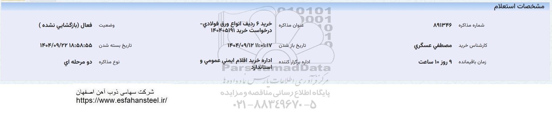 عنوان مذاکره : خرید 6 ردیف انواع ورق فولادی - درخواست خرید 140405191