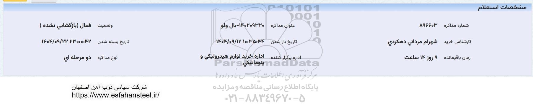 استعلام بها و موضوع استعلام استعلام بال ولو به اطلاع کلیه شرکتها و افراد متخصص واجد شرایط میرساند، آگهی گذار در نظر دارد از طریق استعلام بها، نسبت به انتخاب و دریافت پیشنهادات اقدام نماید. این استعلام با کد آگهی ثبت شده در سامانه خبرگزاری پارس نماد : 9944656 منتشر شده است. مشخصات استعلام : تاریخ شروع استعلام: 1404/09/13 آخرین مهلت ارسال پیشنهاد قیمت : 1404/09/22 و محل اجرای پروژه : استان مناقصات استان اصفهان میباشد. استعلام قیمت مورد درخواست : استعلام بال ولو با دستهبندیهای تخصصی و گروه های مرتبط : شیرآلات, ساخت،نصب و تعمیرات صنایع فولاد, تجهیزات و ماشین آلات صنعتی, استعلام اطلاع رسانی میگردد.