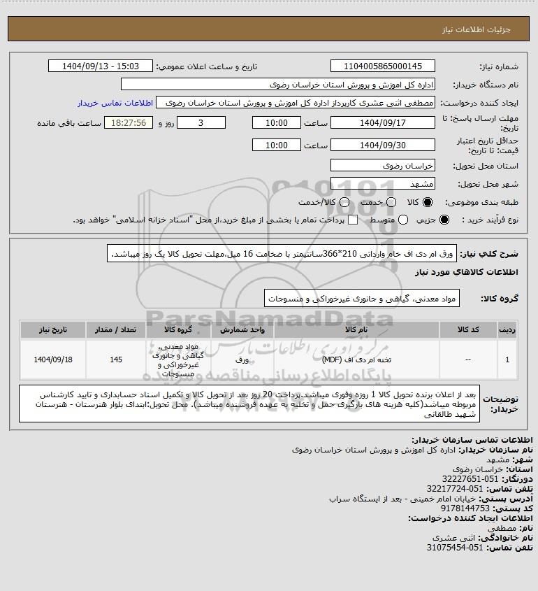 شرح کلی نیاز: ورق ام دی اف خام وارداتی 210*366سانتیمتر با ضخامت 16 میل،مهلت تحویل کالا یک روز میباشد.