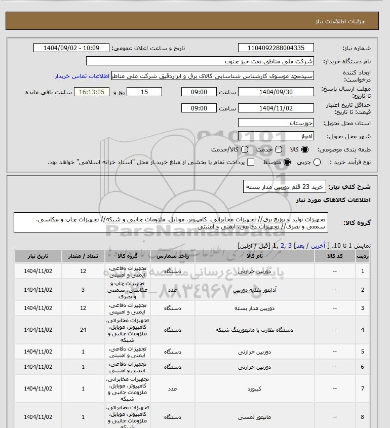 | 9 | -- | دوربین مدار بسته | دستگاه | تجهیزات دفاعی، ایمنی و امنیتی | 15 | 1404/11/02 |