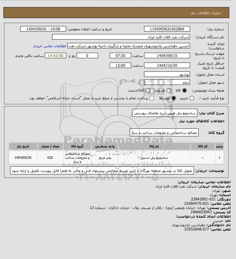 شرح کلی نیاز: ساندویچ پنل طبق شرح تقاضای پیوستی