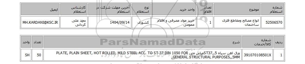 | 1 | 391070108501X | ورق اهن سیاه ST37,,5میلی متر, PLATE, PLAIN SHEET, HOT ROLLED, MILD STEEL ACC. TO ST-37 DIN 1050 FOR GENERAL STRUCTURAL PURPOSES,,5MM, | 50 | SH |