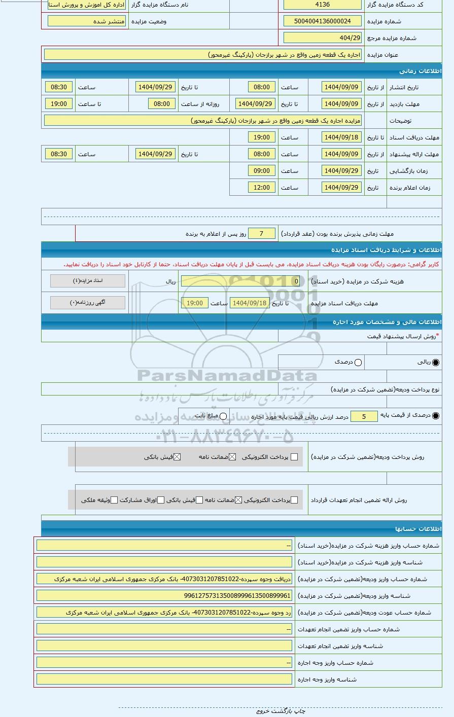 | شماره مورد اجاره | 5104004136000024 | نوع برگزاری مزایده | مزایده عمومی | |