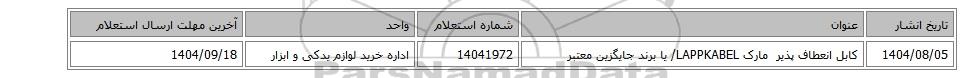 | 1404/08/05 | کابل انعطاف پذیر مارک LAPPKABEL/ یا برند جایگزین معتبر | 14041972 | اداره خرید لوازم یدکی و ابزار | 1404/09/18 |