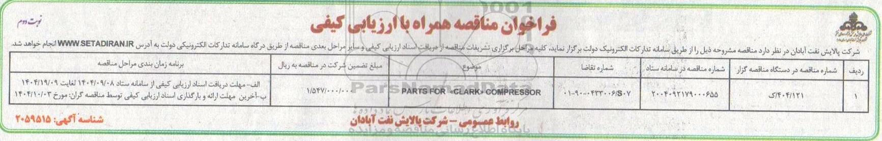 مناقصه PARTS FOR " CLARK " COMPRESSO نوبت دوم از کلیه افراد متخصص و شرکتها واجد شرایط دعوت به عمل میآید در مناقصه با کد خبرگزاری پارس نماد: 9946410 شرکت نمایند.