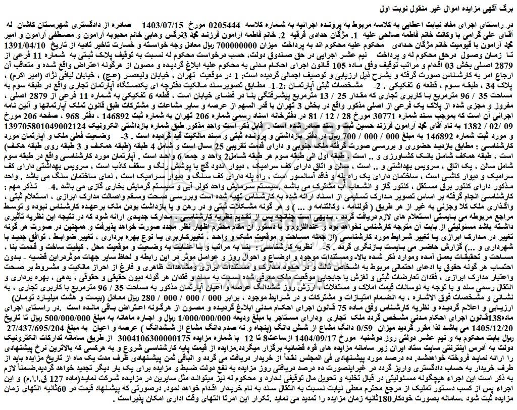 در راستای اجرای مفاد نیابت اعطایی به کلاسه مربوط به پرونده اجرائیه به شماره کلاسه 0205444 مورخ 1403/07/15 صادره از دادگستری شهرستان کاشان له آقای علی گرامی با وکالت خانم فاطمه صالحی علیه 1. مژگان حدادی قرقیه 2. خانم فاطمه آرامون فرزند محمد 3نرگس وهابی خانم محبوبه آرامون و مصطفی آرامون و امیر محمد آرامون با قیومیت خانم مژگان حدادی محکوم علیه محکوم اند به پرداخت میزان 700000000 ریال معادل وجه خواسته و خسارت تاخیر تادیه از تاریخ 1391/04/10 تا زمان وصول درحق محکوم له و پرداخت نیم عشر اجرایی در حق صندوق دولت، حسب درخواست محکوم له نسبت به توقیف پلاک ثبتی به شماره 11 فرعی از 2879 اصلی بخش 03 اقدام و مراتب توقیف وفق ماده 105 قانون اجرای احکام مدنی به محکوم علیه ابلاغ گردیده و مصون از هرگونه اعتراض واقع شده و متعاقب آن ارجاع امر به کارشناس صورت گرفته و بشرح ذیل ارزیابی و توصیف اجمالی گردیده است: 1-در موقعیت تهران ، خیابان ولیعصر (عج) ، خیابان لبافی نژاد (امیر اکرم) ، پلاک 34 ، طبقه سوم ، قطعه 6 تفکیکی . 2- مشخصات ثبتی آپارتمان :2-1- مطابق تصویرسند مالکیت دفترچه ای یکدستگاه آپارتمان تجاری واقع در طبقه سوم به مساحت 35 / 96 مترمربع با کاربری تجاری که مقدار 25 / 13 مترمربع پیشرفتگی بنا در فضای خیابان است ، قطعه 6 تفکیکی به شماره 11 فرعی از 2879 اصلی ، مفروز و مجزی شده از پلاک یک فرعی از اصلی مذکور واقع در بخش 3 تهران با قدر السهم از عرصه و سایر مشاعات و مشترکات طبق قانون تملک آپارتمانها و آئین نامه اجرائی آن است که بموجب سند شماره 30771 مورخ 28 / 12 / 81 در دفترخانه اسناد رسمی شماره 206 تهران به شماره ثبت 146892 ، دفتر 968 ، صفحه 206 مورخ 09 /02 / 1382 به نام آقای محمد آرامون فرزند حسین ثبت و سند صادر شده است . قابل ذکر است واحد مذکور طبق شماره بازداشتی الکرونیک 139705801049002124 و مورد ثبت شماره 146892 به مبلغ 000 / 000 / 700 ریال در دفتر بازداشتی و پرونده ثبتی و سند مالکیت قید گردیده است . 3- وضعیت فعلی ملک و آپارتمان مورد کارشناسی : مطابق بازدید حضوری و بررسی صورت گرفته ملک جنوبی و دارای قدمت تقریبی 25 سال است و شامل 4 طبقه (طبقه همکف و 3 طبقه روی طبقه هکف) است ، طبقه همکف شامل بانک کشاورزی و .. است ، طبقه اول الی طبقه سوم هر طبقه شامل2 واحد و جمعا 6 واحد است . آپارتمان مورد کارشناسی واقع در طبقه سوم شامل سالن ، یک اتاق ، سرویس بهداشتی و .. است ، سالن و اتاق دارای کف سرامیک ، دیوار اندود گچ با پوشش رنگ و سقف کاذب است ، سرویس بهداشتی دارای کف سرامیک و دیوار کاشی است ، ساختمان دارای یک راه پله و فاقد آسانسور است ، راه پله دارای کف سنگ و دیوار سرامیک است ، نمای ساختمان سنگ می باشد . واحد مذکور دارای کنتور برق مستقل ، کنتور گاز و انشعاب آب مشترک می باشد .سیستم سرمایش واحد کولر آبی و سیستم گرمایش بخاری گازی می باشد .4- تذکر مهم : کارشناسی انجام گرفته بر اساس تصویر مدارک تسلیمی از اسناد ارائه شده به کارشناس تهیه شده است وبررسی صحت وسقم واصالت مدارک ابرازی ، استعلام ثبتی ، واگذاری ملک کلا وجزئی به غیر از هر طریق ( قولنامه ، وکالتنامه و ... ) و هر گونه مشکلات ثبتی و در رهن و یا بازداشت بودن ملک برعهده کارشناس نبوده و توسط مراجع مربوطه می بایستی استعلام های لازم دریافت گردد ، بدیهی است چنانچه پس از تقدیم نظریه کارشناسی ، مدارک جدیدی ارائه شود که در نتیجه این نظریه تأثیری داشته باشد مسئولیتی از بابت آن متوجه کارشناس نخواهد بود و عنداللزوم و با دستور آن مقام محترم اظهار نظر مجدد صورت خواهد پذیرفت و همچنین در صورت هر گونه تغییر در مدارک ابرازی یا تغییر شرایط مورد کارشناسی (از جمله مساحت و موقعیت ملک و واحد ، تغییرکاربری یا نوع بهره برداری ، تغییر ضوابط ، توافق جدید با شهرداری و ...) گزارش حاضر می بایست بازنگری گردد . 5- نظریه کارشناسی : بنا به مراتب و با عنایت به وضعیت و موقعیت محل ، کیفیت ساخت و قدمت بنا ، مساحت و تحقیقات بعمل آمده وموارد ذکر شده بالا ومستندات موجود و اوضاع و احوال روز و عوامل موثر در این رابطه و ل