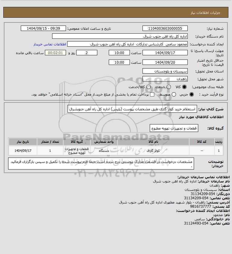 شرح کلی نیاز: استعلام خرید کولر گازی طبق مشخصات پیوست (پلیس) اداره کل راه آهن جنوبشرق