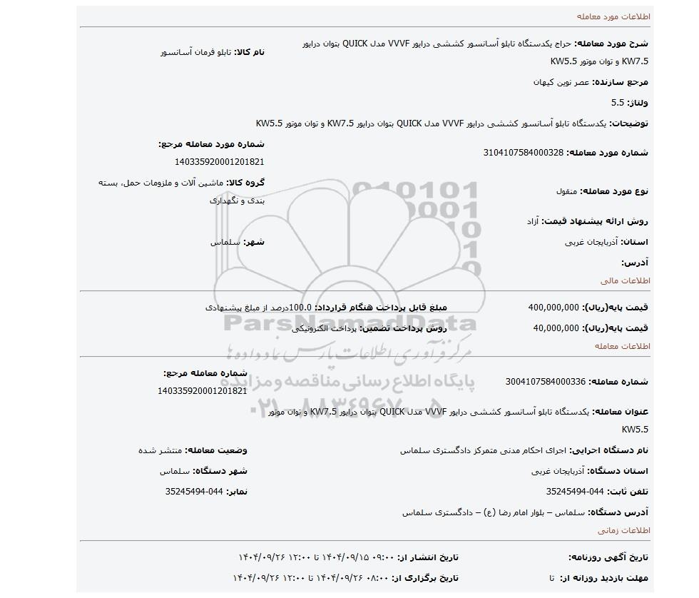 | شرح مورد معامله: حراج یکدستگاه تابلو آسانسور کششی درایور VVVF مدل QUICK بتوان درایور KW7.5 و توان موتور KW5.5 | نام کالا: تابلو فرمان آسانسور | |