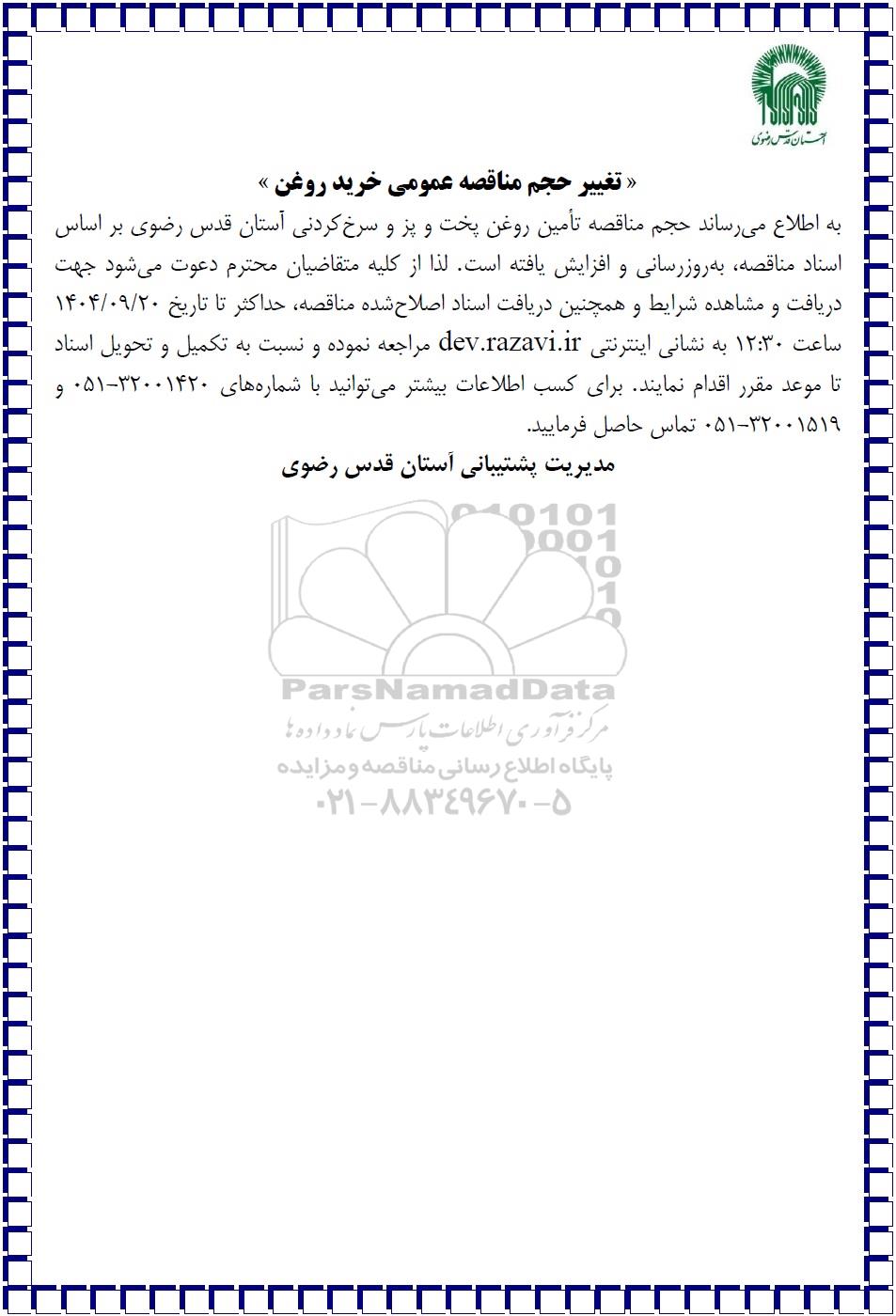 به اطلاع می رساند حجم مناقصه تأمین روغن پخت و پز و سرخ کردنی آستان قدس رضوی بر اساس اسناد مناقصه، به روزرسانی و افزایش یافته است. لذا از کلیه متقاضیان محترم دعوت می شود جهت دریافت و مشاهده شرایط و همچنین دریافت اسناد اصلاح شده مناقصه حداکثر تا تاریخ 1404.09.20 ساعت 12:30 به نشانی اینترنتی dev.razavi.ir مراجعه نموده و نسبت به تکمیل و تحویل اسناد تا موعد مقرر اقدام نمایند. برای کسب اطلاعات بیشتر می توانید با شماره های 32001420 - 051 و 32001519 - 051 تماس حاصل فرمایید.