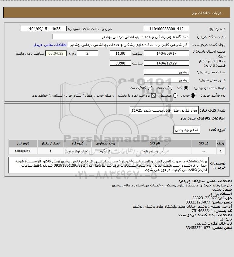 شرح کلی نیاز: مواد غذایی طبق فایل پیوست شده 11425