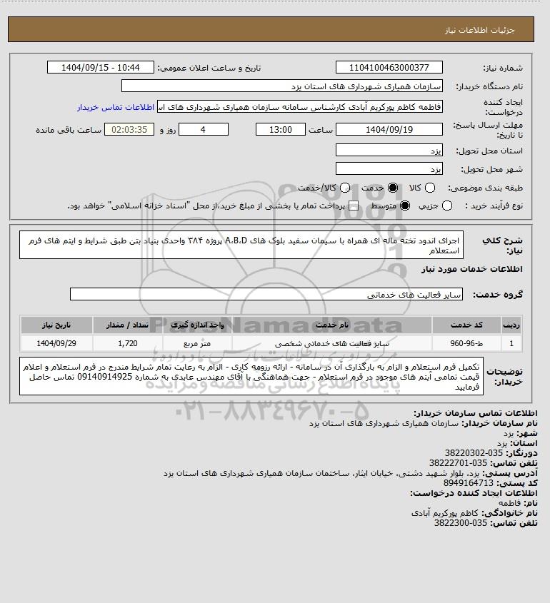 شرح کلی نیاز: اجرای اندود تخته ماله ای همراه با سیمان سفید بلوک های A،B،D پروژه ۳۸۴ واحدی بنیاد بتن طبق شرایط و ایتم های فرم استعلام