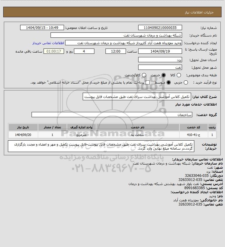 شرح کلی نیاز: تکمیل کلاس آموزشی بهداشت سرای تفت طبق مشخصات فایل پیوست