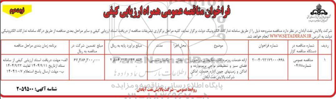 | 1 | مناقصه عمومی 04/78 | 2004092179000668 | ارائه خدمات روزمره کاشت، نگهداری و راهبری فضای سبز و تنظیفات نواحی بریم، بوارده و اماکن و زمینهای چمن اداره خدمات اماکن شرکت پالایش نفت آبادان | 2.514.313.239.882 | 67.386.300.000 |