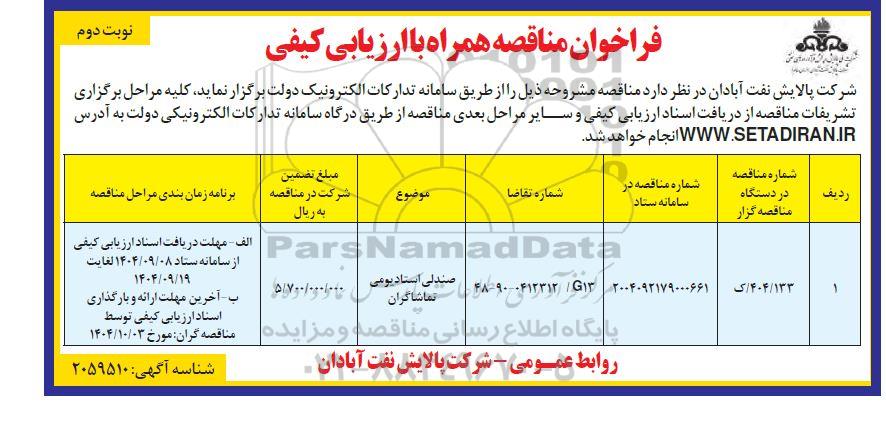 شرکت پالایش نفت آبادان در نظر دارد مناقصه مشروحه ذیل را از طریق سامانه تدارکات الکترونیک دولت برگزار نماید، کلیه مراحل برگزاری تشریفات مناقصه از دریافت اسناد ارزیابی کیفی و سایر مراحل بعدی مناقصه از طریق درگاه سامانه تدارکات الکترونیکی دولت به آدرس ستاد ایران انجم خواهد شد.
