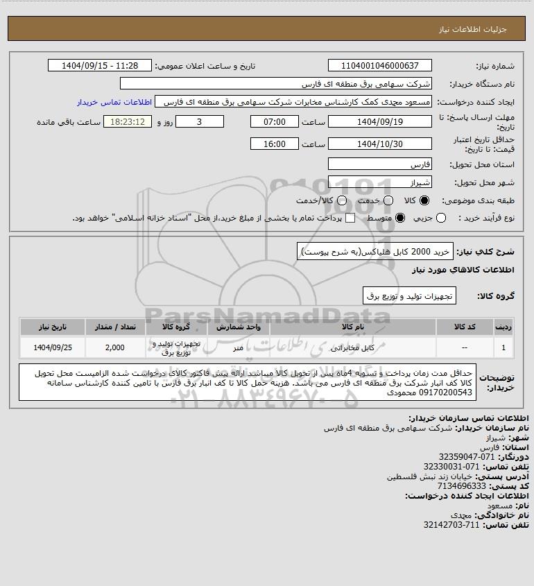 شرح کلی نیاز: خرید 2000 کابل هلیاکس(به شرح پیوست)