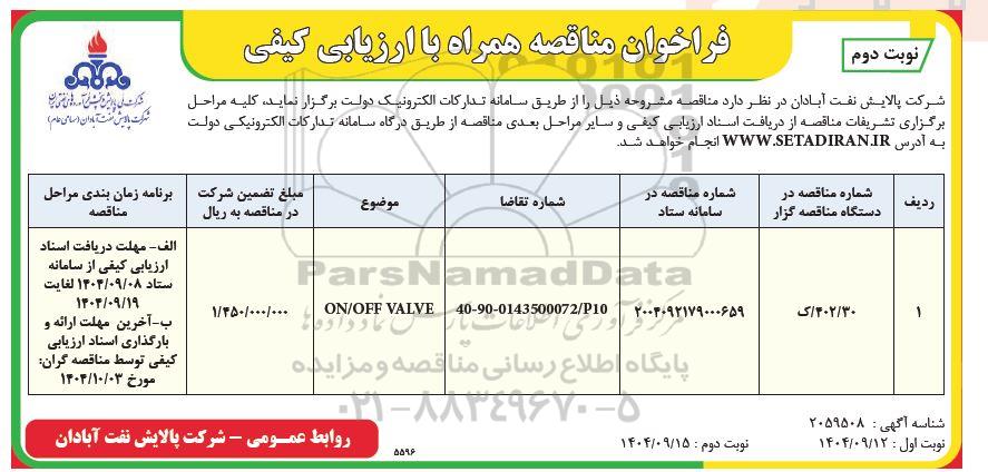 مناقصه ON/OFF VALVE- نوبت دوم از کلیه افراد متخصص و شرکتها واجد شرایط دعوت به عمل میآید در مناقصه با کد خبرگزاری پارس نماد: 9950190 شرکت نمایند.
