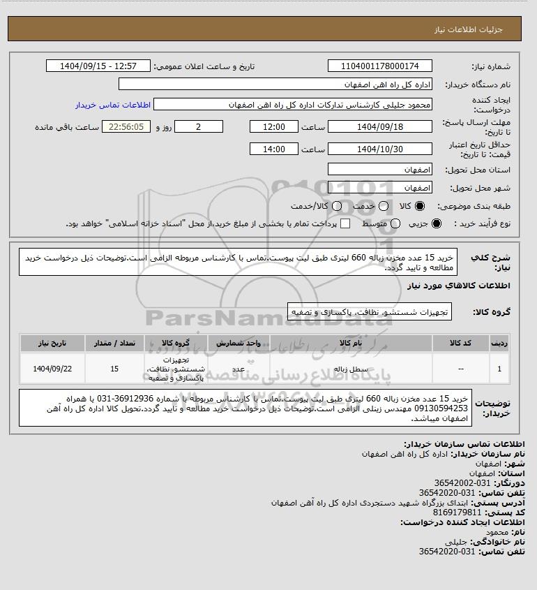 توضیحات خریدار:خرید 15 عدد مخزن زباله 660 لیتری طبق لیت پیوست.تماس با کارشناس مربوطه با شماره 36912936-031 یا همراه 09130594253 مهندس زینلی الزامی است.توضیحات ذیل درخواست خرید مطالعه و تایید گردد.تحویل کالا اداره کل راه آهن اصفهان میباشد.
