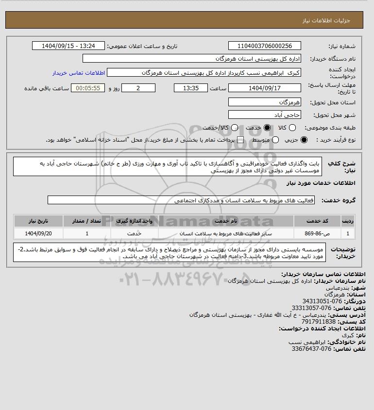 شرح کلی نیاز: بابت واگذاری فعالیت خودمراقبتی و آگاهسازی با تاکید تاب آوری و مهارت ورزی (طر ح خاتم) شهرستان حاجی آباد به موسسات غیر دولتی دارای مجوز از بهزیستی