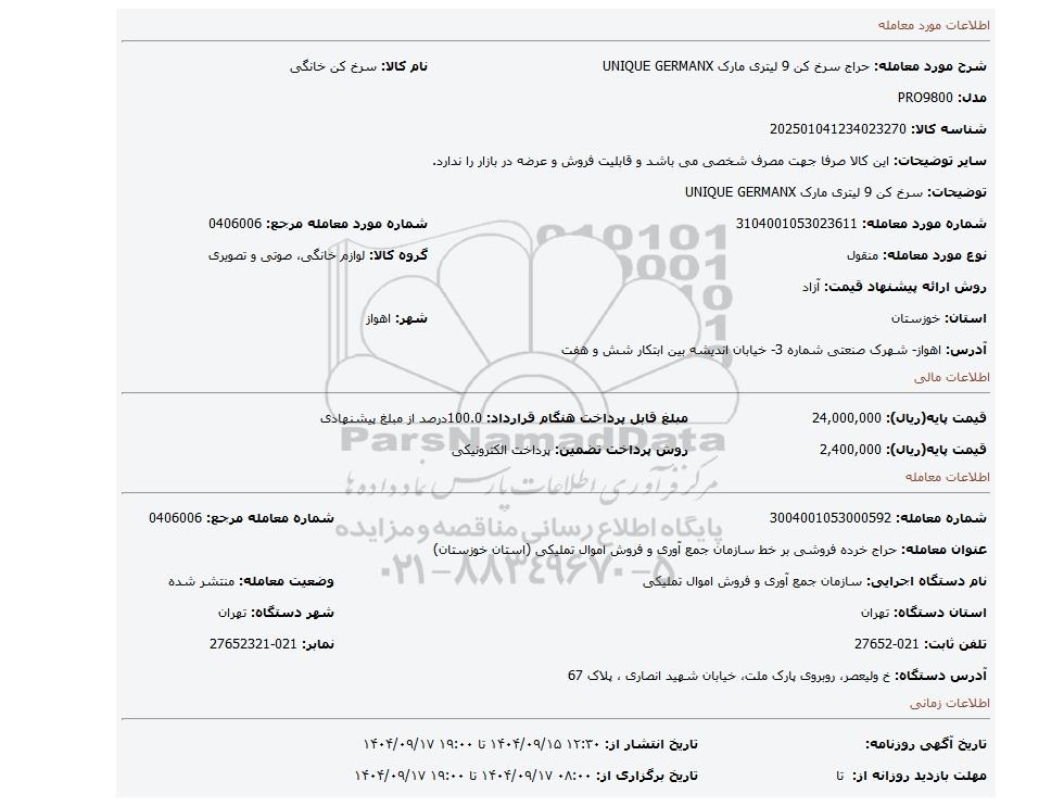 | عنوان معامله: حراج خرده فروشی بر خط سازمان جمع آوری و فروش اموال تملیکی (استان خوزستان) | ||